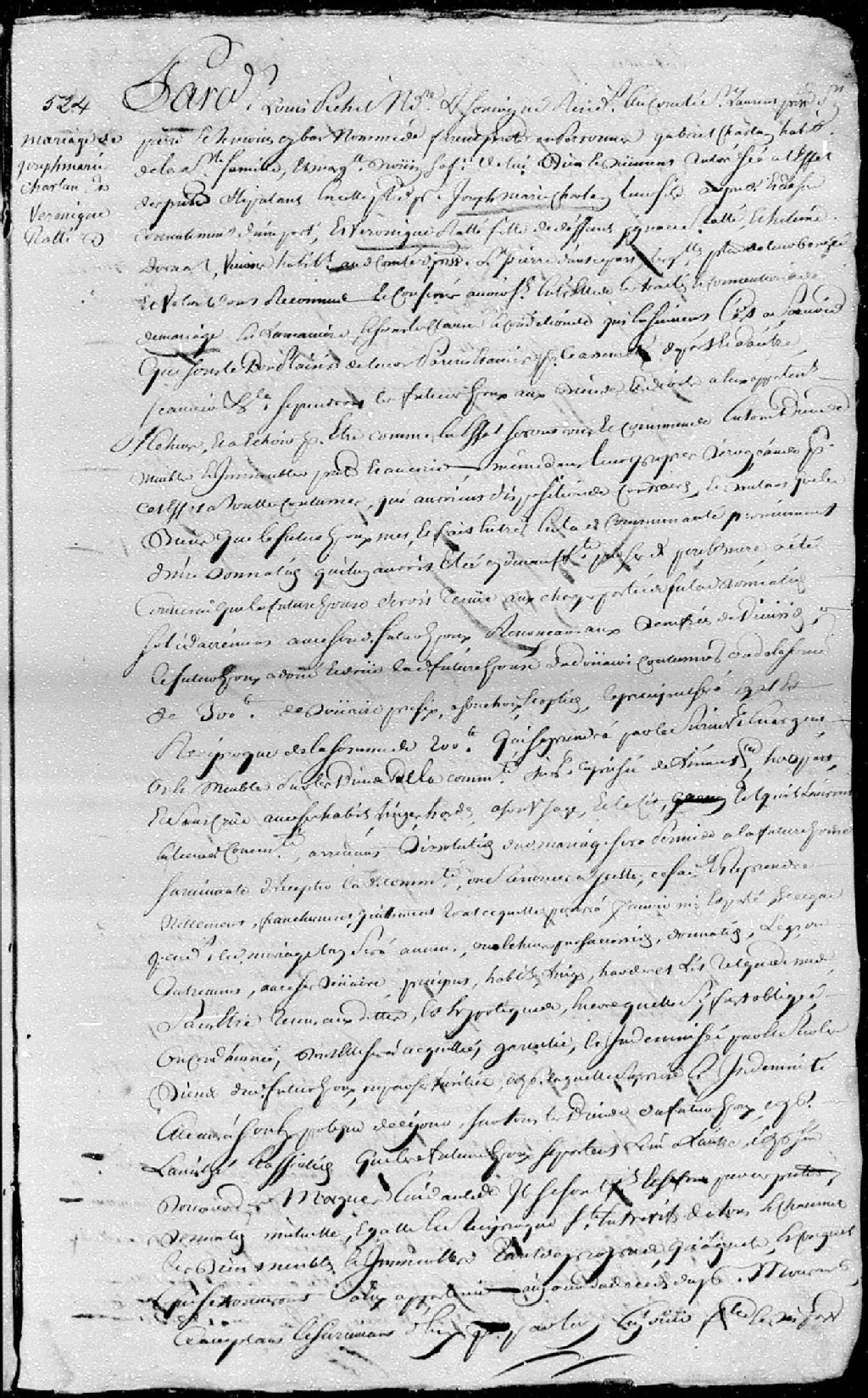 Contrat de mariage passé pardevant Louis Pichet, notaire, entre Joseph-Marie Charlan (Charland), fils de Gabriel Charlan (Charland), habitant du comté de Saint-Laurent, paroisse Sainte-Famille (île d'Orléans), et de Marguerite Drouin, ses père et mère; et Véronique Ratté (Raté), fille des défunts Ignace Ratté (Raté) et Hélène Dorval (Bouchard dit Dorval), ses père et mère, vivants habitants audit comté, paroisse Saint-Pierre, 12 avril 1746 (Document insinué le 17 mai 1746), Archives nationales à Québec, Fonds Cour supérieure. District judiciaire de Québec. Insinuations, (03Q,CR301,P2638).
