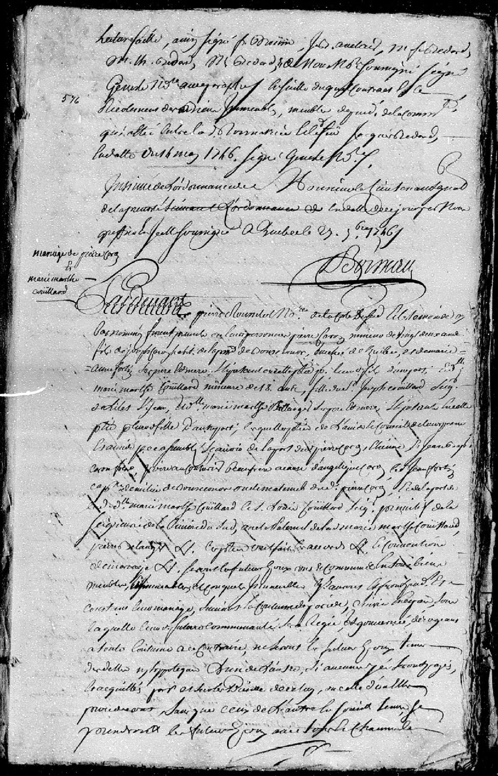 Contrat de mariage passé pardevant Pierre Rousselot, notaire de la côte du Sud, entre Pierre Caron, mineur de vingt-deux ans, fils de Joseph Caron (dit Dussault), habitant de la paroisse de Bonsecours, évêché de Québec, et de Marie-Anne Fortin, ses père et mère; et Marie-Marthe Couillard, mineure de dix-huit ans, fille de Joseph Couillard, seigneur de L'Islet-Saint-Jean, et de Marie-Marthe Bellanger (Bélanger), ses père et mère