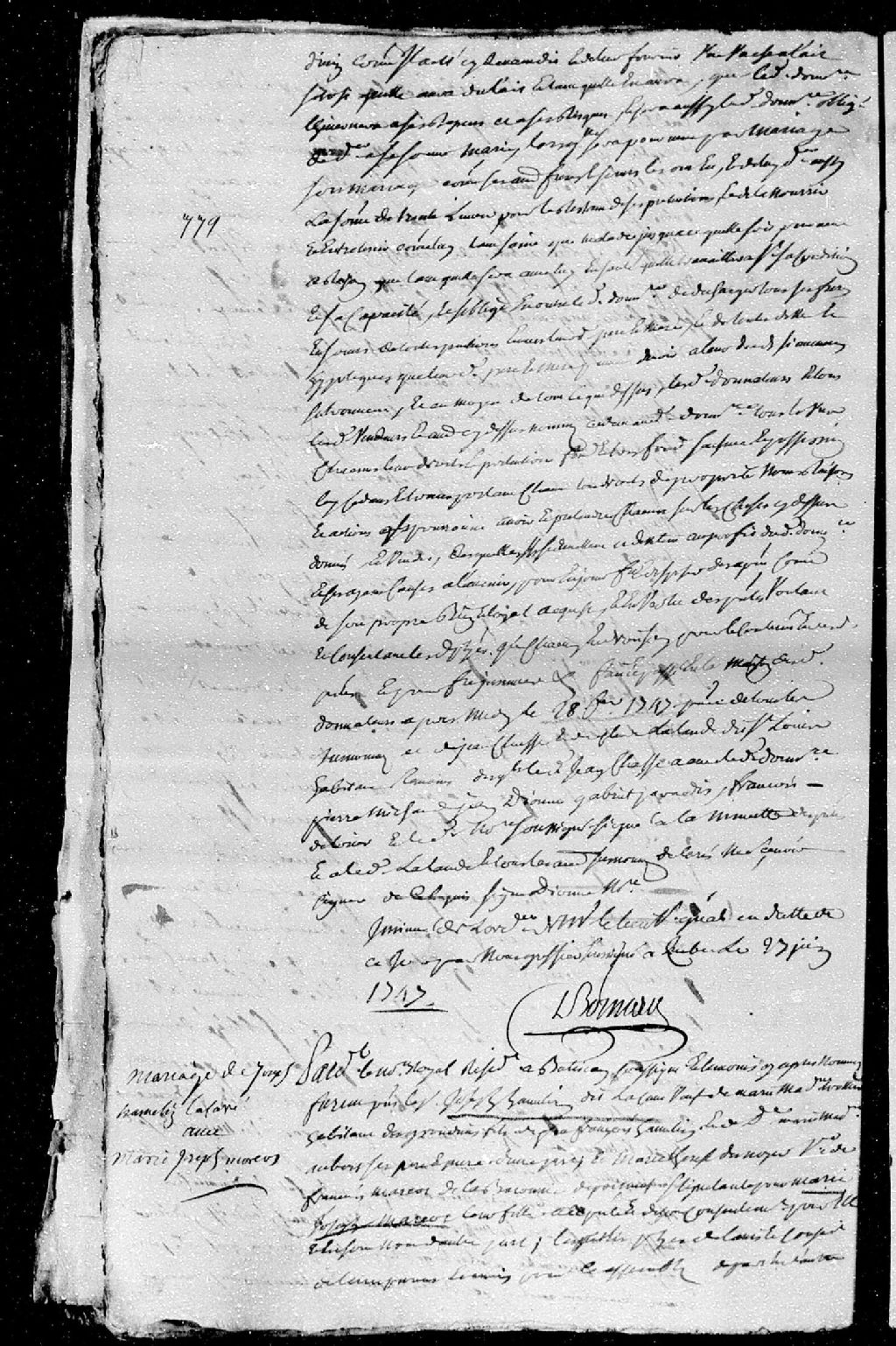 Contrat de mariage passé pardevant Pollet, notaire royal en la seigneurie de Batiscan, entre Joseph Hamelin dit Lacave, veuf de Marie-Madeleine Trottier, habitant des Grondines, fils de feu François Hamelin et de Marie-Madeleine Aubert, ses père et mère; et Marie-Josèphe Marcot, fille de défunt François Marcot et de Marie-Thérèse Desnoyers, ses père et mère, de la baronnerie de Portneuf