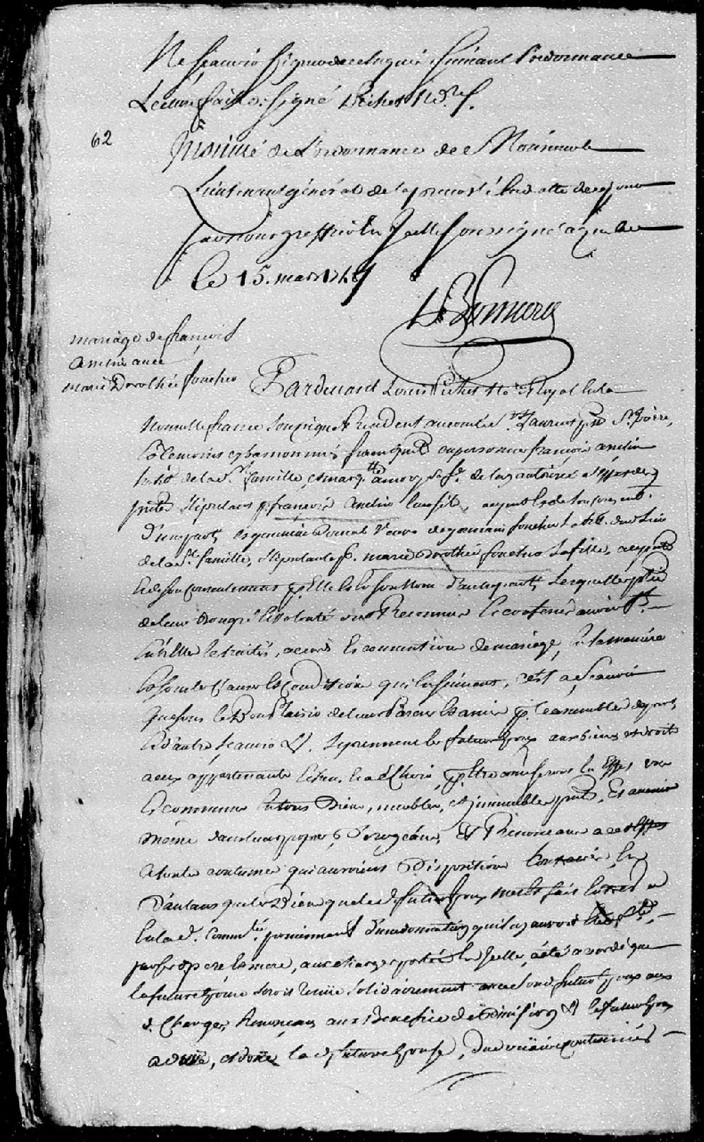 Contrat de mariage passé pardevant Louis Pichet, notaire royal en la Nouvelle-France, entre François Asselin, fils de François Asselin, habitant du comté Saint-Laurent (île d'Orléans), paroisse Sainte-Famille, et de Marguerite Amory (Amaury), ses père et mère; et Marie-Dorothée Foucher, fille de défunt Gervais Foucher, habitant dudit lieu de la Sainte-Famille, et de Marie-Geneviève Dorval (Bouchard dite Dorval), ses père et mère, 19 janvier 1748 (Document insinué le 15 mars 1748), Archives nationales à Québec, Fonds Cour supérieure. District judiciaire de Québec. Insinuations, (03Q,CR301,P2846).