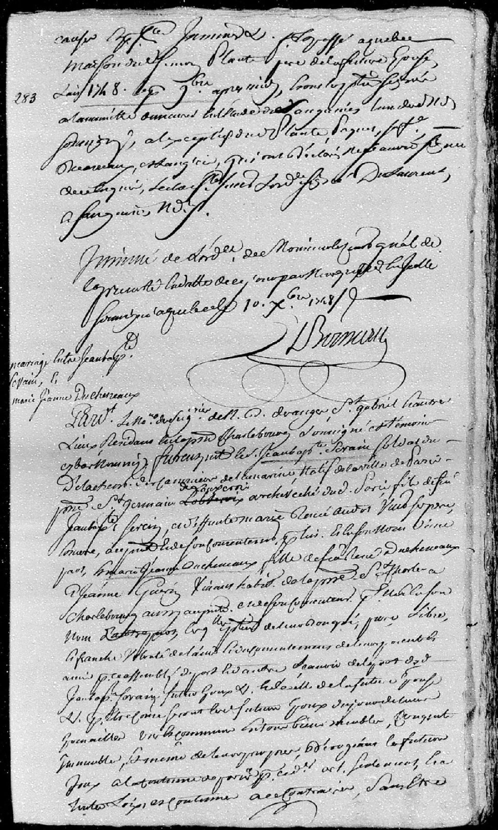 - La pièce se compose d'un contrat de mariage passé par-devant Geneste (Genest), notaire des seigneuries de Notre-Dame-des-Anges, Saint-Gabriel et autres lieux, entre Jean-Baptiste Sevain (Sevin dit Lafontaine), soldat du détachement des canonniers de la Marine, natif de la ville de Paris, paroisse de Saint-Germain-L¿Auxerrois, archevêché de Paris, fils des défunts Jean-Baptiste Sevein (Sevin) et Marie-Renée Audot, ses père et mère; et Marie-Jeanne Ducheneaux (Duchesneau), fille des défunts René Ducheneaux (Duchesneau dit Sansregret) et Jeanne Guérin, ses père et mère, de leur vivant habitants de la paroisse Saint-Charles à Charlesbourg