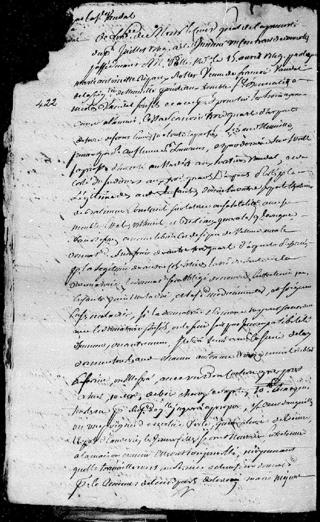 - Le titre complet de la pièce se lit comme suit : Donation par Marie-Antoinette Ripaux Rollet (Ripault dit Rolet), veuve de défunt François Vandal, demeurant en la seigneurie de Neuville, à la Pointe-aux-Trembles; à Nicolas Vandal, son fils; à savoir une portion de terre contenant trois quarts d'arpent de front, sise audit lieu de Neuville, sur le bord du fleuve Saint-Laurent, et en outre la part et portion qui appartient à la donatrice dans tous les bâtiments construits sur l'ensemble de la terre, avec ses meubles, ustensiles, effets mobiliers et bestiaux; la présente donation est passée par-devant maître Pollet, notaire