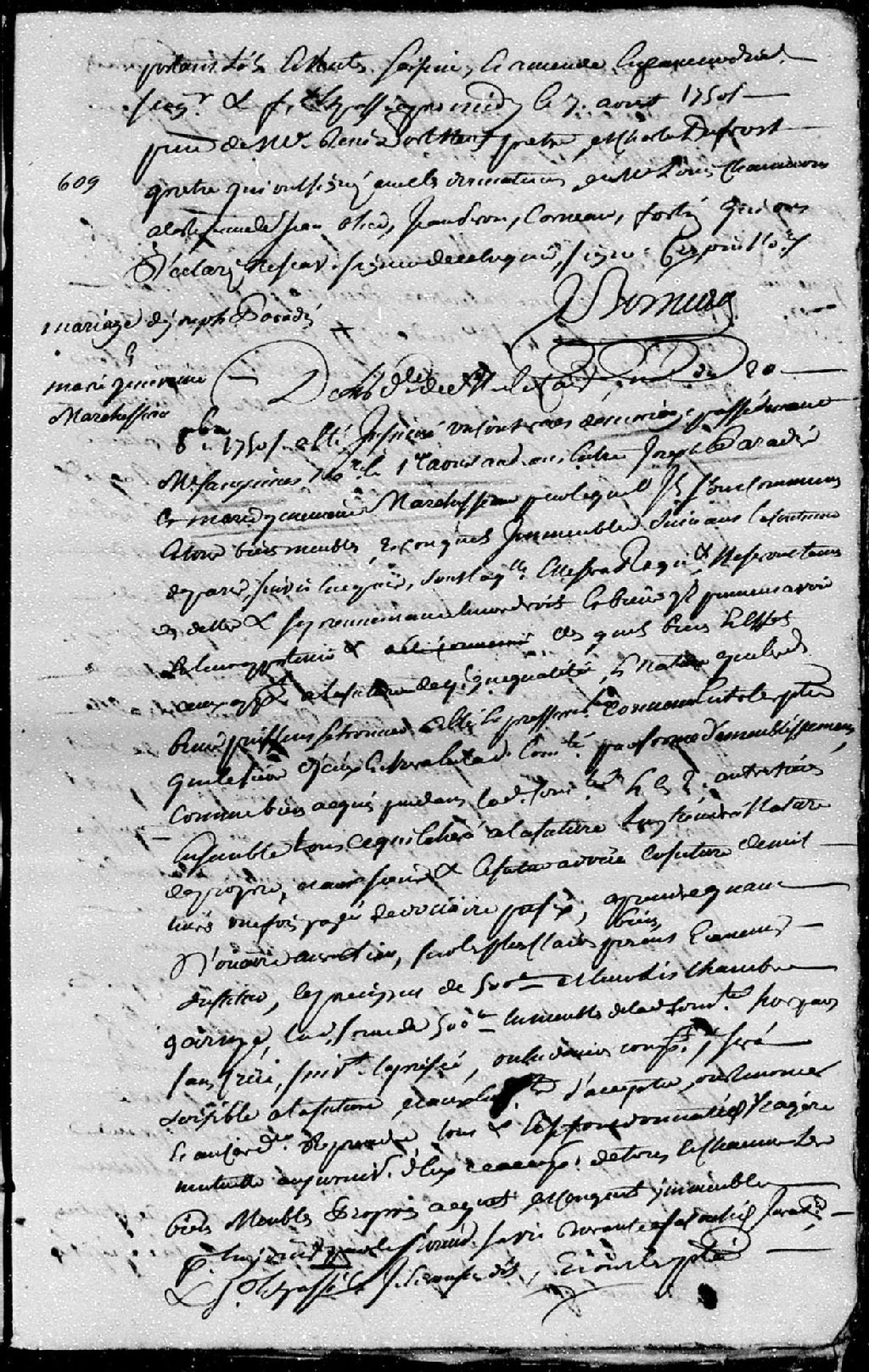 Extrait du contrat de mariage passé pardevant Sanguinet et Lanoullier (Lanouiller), notaires, entre Joseph Paradis et Marie-Geneviève Marchesseau (Marchessault), 1er août 1750 [Document insinué le 20 octobre 1750], Archives nationales à Québec, Fonds Cour supérieure. District judiciaire de Québec. Insinuations, (03Q,CR301,P3275).