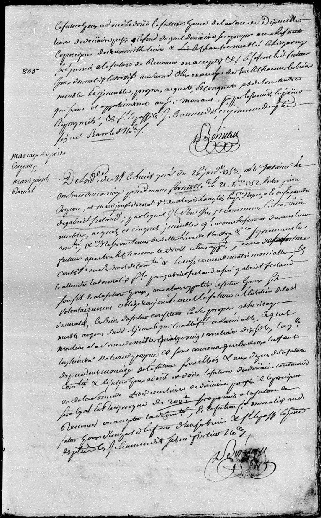 Extrait du contrat de mariage passé pardevant maître Fortier, notaire, entre Pierre Crépeau; et Marie-Josèphe Dorval (Bouchard dit Dorval), veuve en premières noces de feu Alexis Langlois, et en secondes noces de feu Gabriel Freland (Ferland)