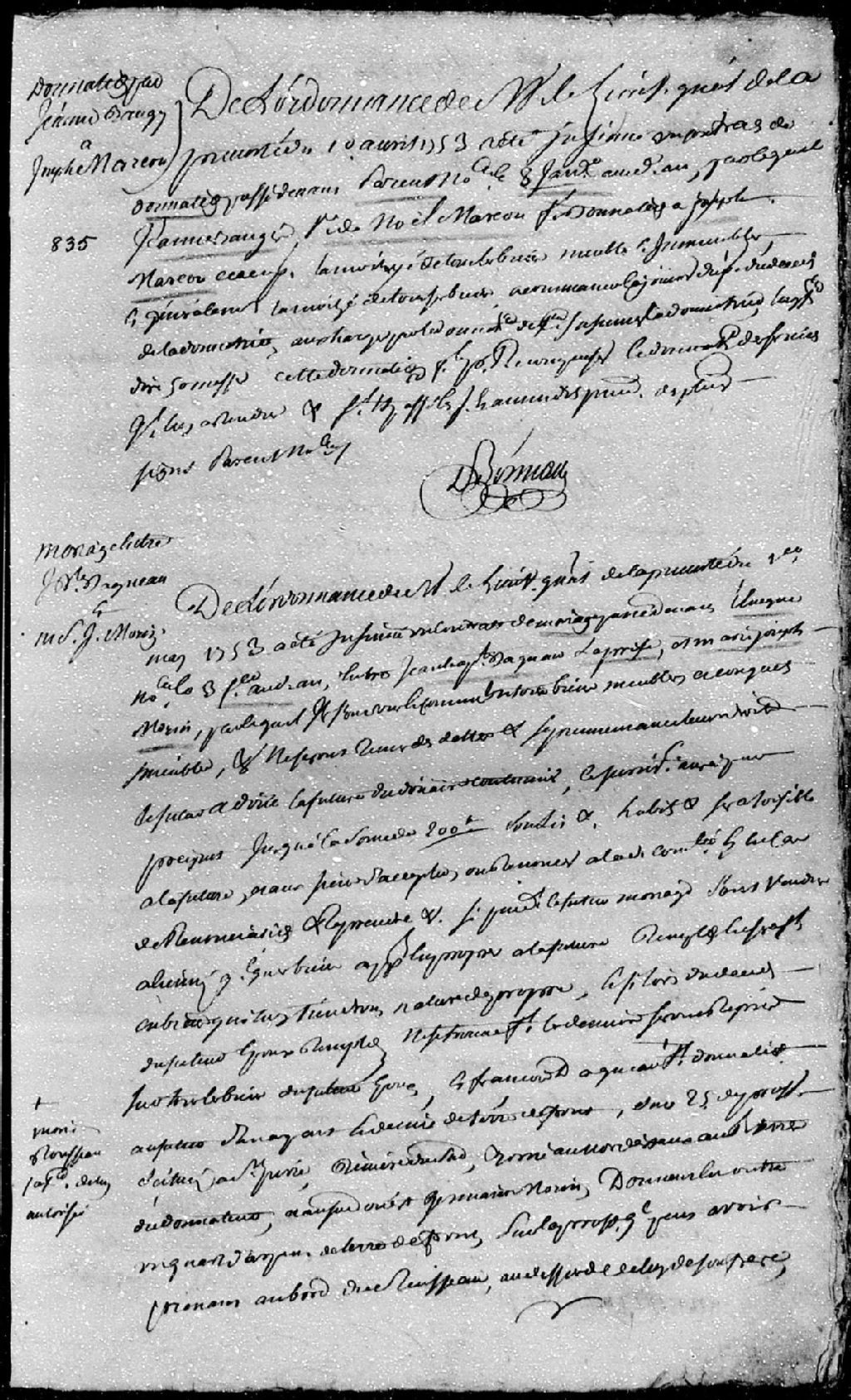 Donation par Jeanne-Thérèse Beaugy (Baugis), veuve de feu Noël Marcou (Marcoux); à Joseph Marcou (Marcoux); à savoir la moitié de tous les biens meubles et immeubles de la donatrice; la présente donation est passée pardevant maître Parent, notaire, 8 janvier 1753 [Document insinué le 10 avril 1753], Archives nationales à Québec, Fonds Cour supérieure. District judiciaire de Québec. Insinuations, (03Q,CR301,P3631).