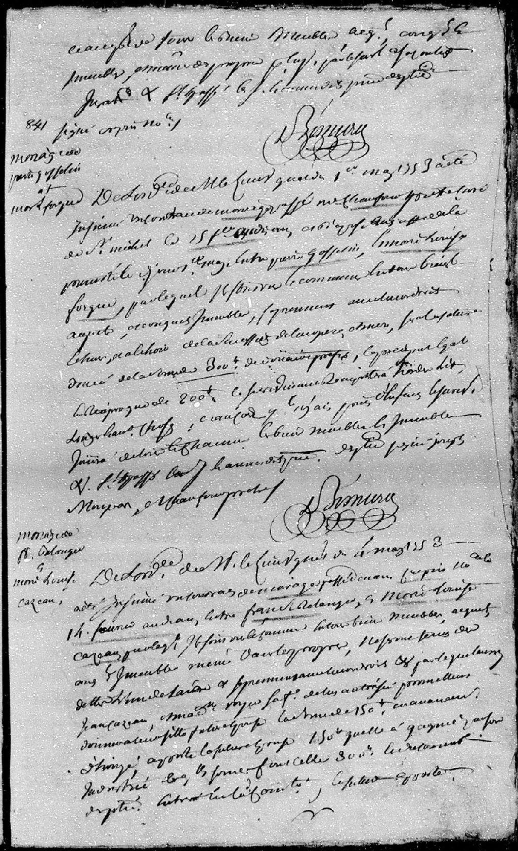 Extrait du contrat de mariage passé pardevant maître Crespin, notaire, entre François Bélanger; et Marie-Louise Cazeau (Caseau - Cazault), fille de Jean Cazeau (Caseau - Cazault) et de Marie-Madeleine Voyer, ses père et mère, 14 février 1758 [Document insinué le 4 mai 1753], Archives nationales à Québec, Fonds Cour supérieure. District judiciaire de Québec. Insinuations, (03Q,CR301,P3641).