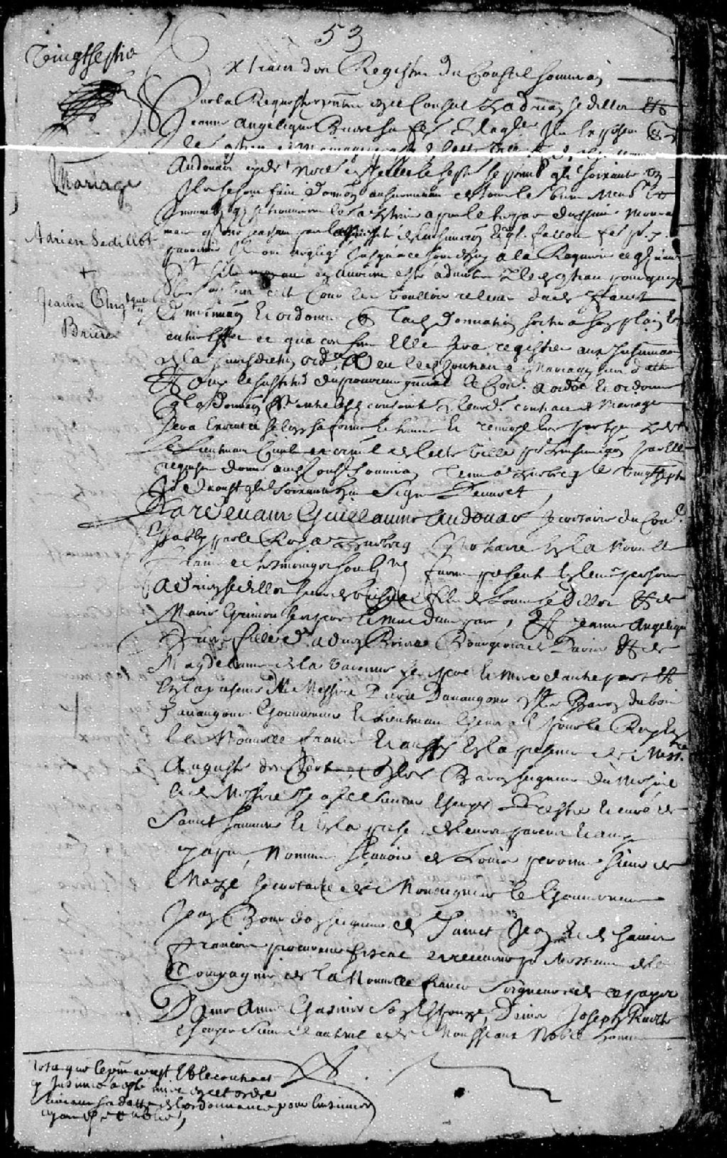 Le titre complet de la pièce se lit comme suit : Mariage entre Adrien Sédillot, sieur de Brisval, fils de Louis Sédillot et de Marie Grimou (Grimoult), ses père et mère, et Jeanne-Angélique Brière, fille d'Adrien Brière, bourgeois de Paris, et Madeleine de la Varanne (Marguerite de la Varanne), ses père et mère, sont présent messire Pierre d'Avaugour (Davaugour), baron du Bois (Dubois) et d'Avaugour (Davaugour), lieutenant général pour le Roi en Nouvelle-France, Augustin Descartes, chevalier, baron et seigneur du Mesnil, messire Jean LeSueur, écuyer, prêtre et curé de Saint-Sauveur, Louis Péronne, sieur Mazé, secrétaire de monsieur le Gouverneur, Jean Bourdon, seigneur de Saint-Jean et de Saint-François, procureur fiscal et receveur pour les sieurs de la Compagnie de la Nouvelle-France, dame Anne Gasnier (Gagnier - Ganier), son épouse, Denis-Joseph Ruette, écuyer, sieur d'Auteuil et de Monceaux (Monsseaux), Louis Rouer, sieur de [...]
