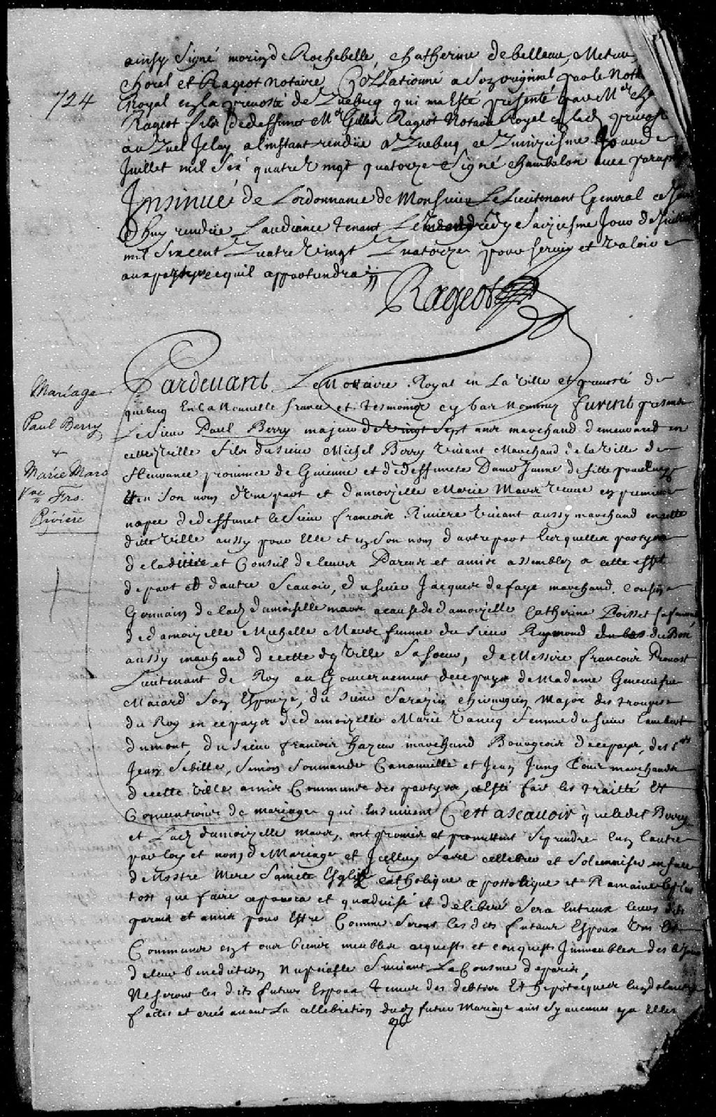 - Le titre complet de la pièce se lit comme suit : Contrat de mariage passé par-devant le sieur Chambalon, notaire royal en la ville et Prévôté de Québec, entre Paul Berry, majeur de 27 ans, marchand demeurant à Québec, fils du sieur Michel Berry, vivant marchand de la ville de Fleurance, province de Guyenne (Gascogne), et de défunte Jeanne Defitte; et Marie Mars, veuve en premières noces de feu François Rivière, vivant marchand de Québec; sont présents le sieur Jacques de Faye (Faille), marchand, époux de Marie-Catherine Poisset; Michelle Mars, femme de Raymond Dubosq, aussi marchand de Québec; Messire François Provost, lieutenant du Roi au gouvernement de ce pays, et Geneviève Macard, son épouse; le sieur Sarrazin, chirurgien major des troupes du Roi; Marie Vanneck, femme du sieur Lambert dit Dumont; François Hazeur, marchand bourgeois de Québec; Jean Sébille, Simon Soumande Cananville et Jean Jung, marchands de Québec; tous amis et parents des futurs époux; sont également présents les sieurs Charles Pinguet et Charles Rageot, témoins