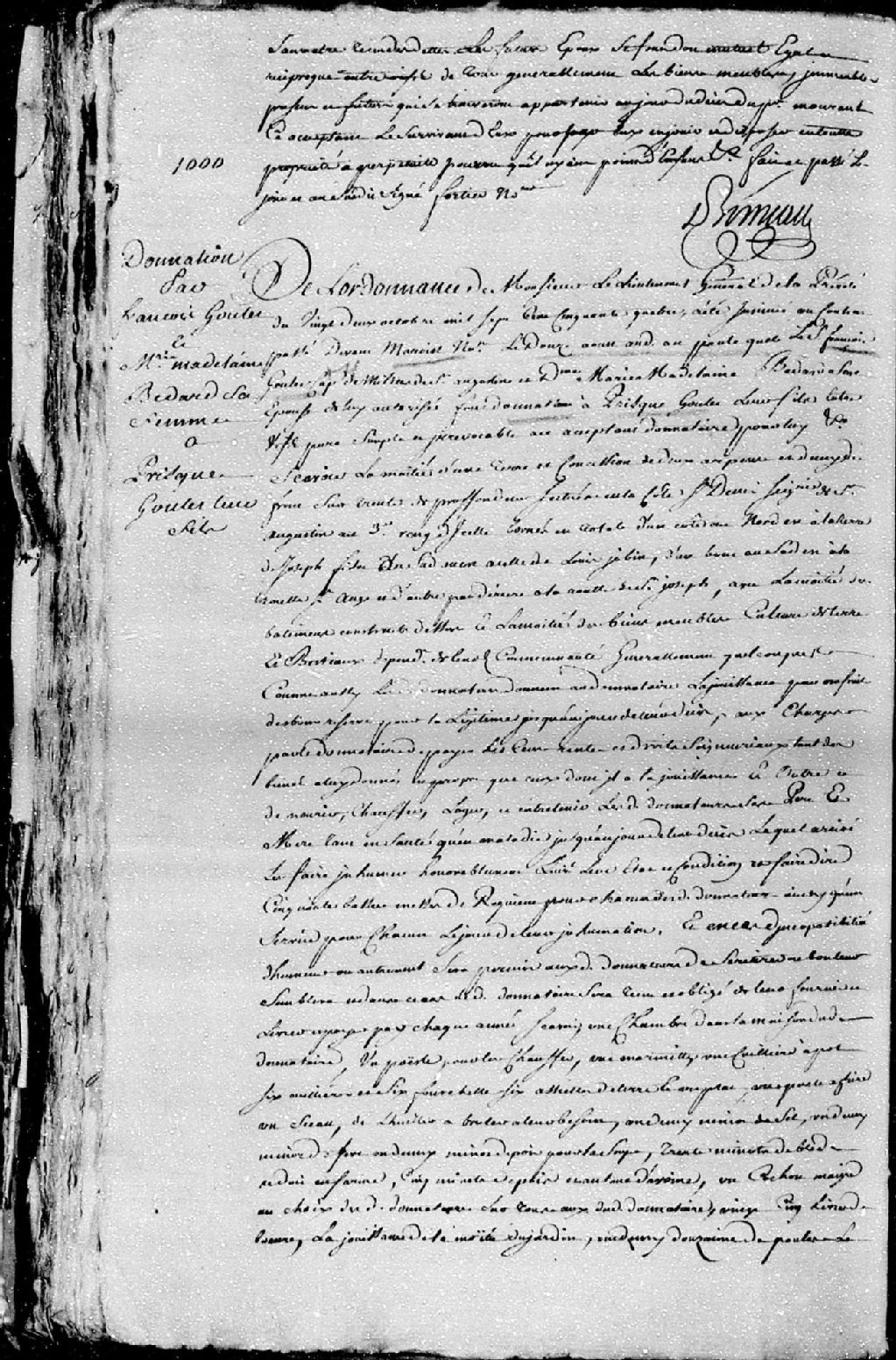 - Donation par François Goulet, capitaine de milice de Saint-Augustin, et Marie-Madeleine Bédard, son épouse; à Prisque Goulet, leur fils; à savoir la moitié d'une terre et concession située en la côte Saint-Denis...