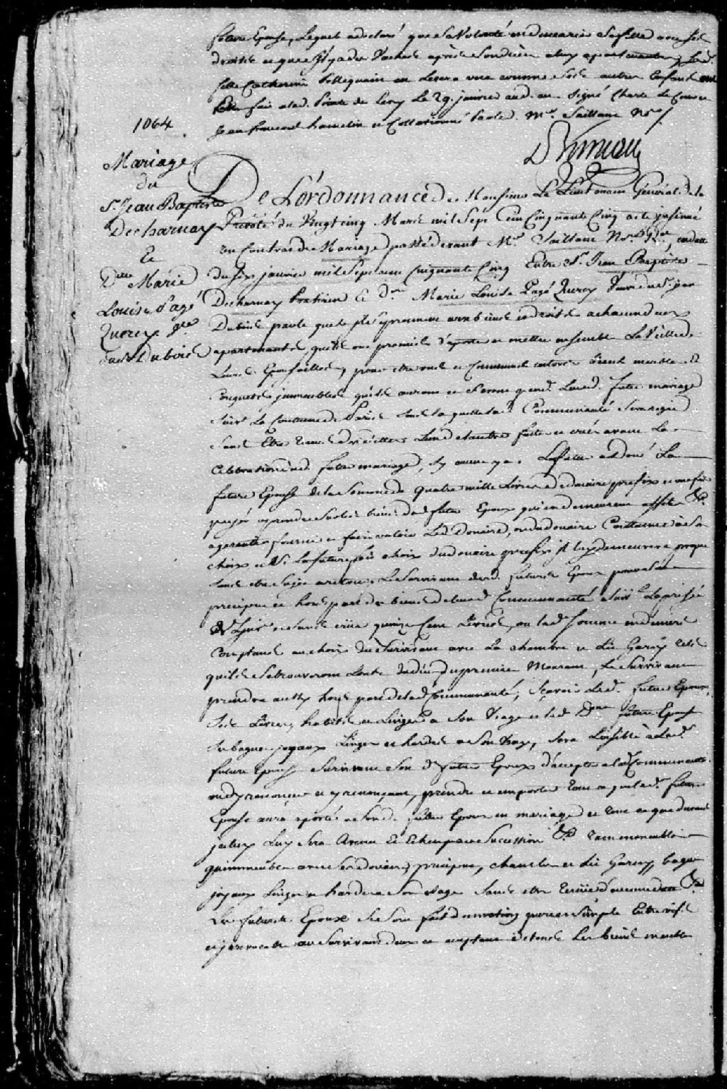 Extrait du contrat de mariage passé pardevant maître Saillant, notaire, entre Jean-Baptiste Decharnay (Decharney); et Marie-Louise Pagé dit Quercy, veuve de feu Jean Dubois, 6 janvier 1755 [Document insinué le 25 mars 1755], Archives nationales à Québec, Fonds Cour supérieure. District judiciaire de Québec. Insinuations, (03Q,CR301,P3903).