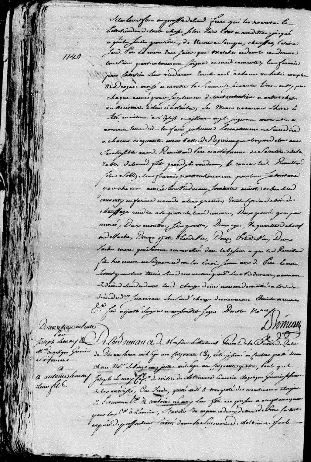 Vente d'une terre sise dans la seigneurie de Lotbinière avec quelques animaux, meubles et la moitié d'une charrue; par Joseph Lemay, capitaine de milice de Lotbinière, et Marie-Angélique Grenier (Garnier), sa femme; à Antoine Lemay, leur fils; le présent contrat de vente est passé pardevant maître Choret, notaire
