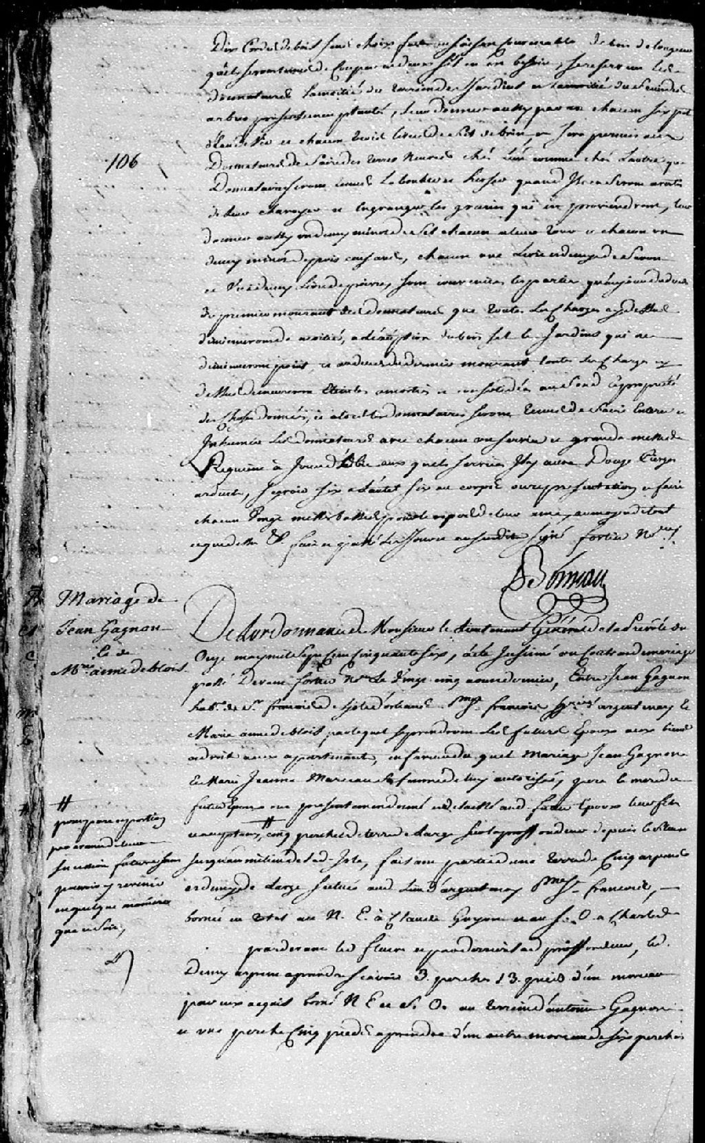 Extrait du contrat de mariage passé pardevant maître Fortier, notaire, entre Jean Gagnon, habitant de Saint-François de l'île d'Orléans, paroisse Saint-François, en la seigneurie d'Argentenay, fils de Jean Gagnon et de Marie-Jeanne Marceau, ses père et mère; et Marie-Anne DeBlois, fille de Jean-Baptiste DeBlois et Catherine Gagné, ses père et mère, 25 août 1755 [Document insinué le 11 mai 1756], Archives nationales à Québec, Fonds Cour supérieure. District judiciaire de Québec. Insinuations, (03Q,CR301,P4058).