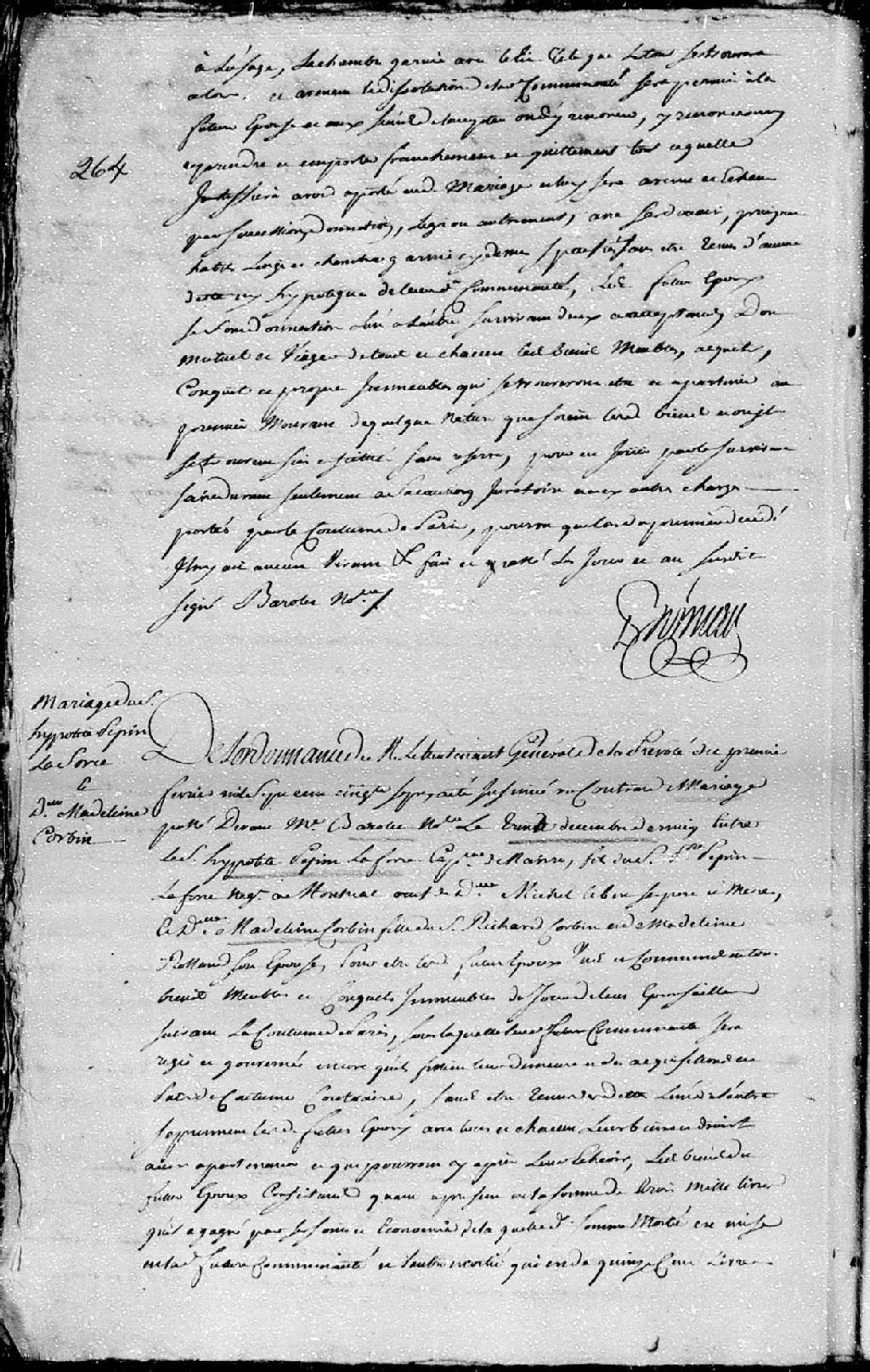 Extrait du contrat de mariage passé pardevant maître Barolet, notaire, entre Hippolyte Pepin dit Laforce, capitaine de navire, fils de Pierre Pepin dit Laforce, négociant à Montréal, et de défunte Michelle Leber, ses père et mère; et Madeleine Corbin, fille de Gaspard-Richard Corbin et de Madeleine Rolland, 30 décembre 1756 [Document insinué le 1er février 1757], Archives nationales à Québec, Fonds Cour supérieure. District judiciaire de Québec. Insinuations, (03Q,CR301,P4164).
