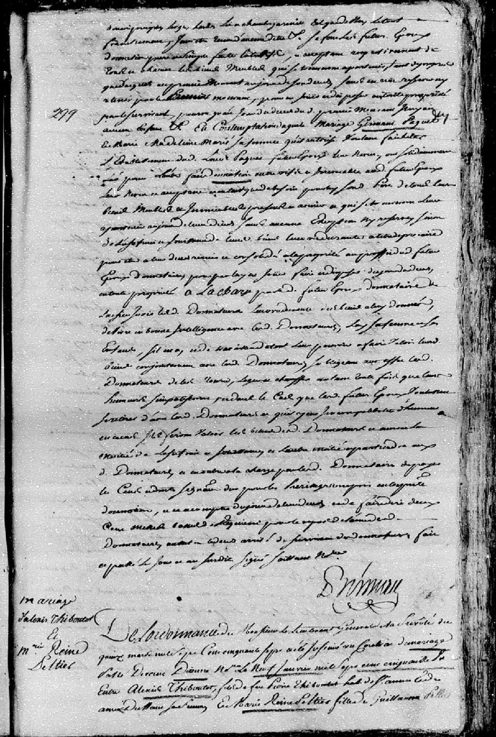 Extrait du contrat de mariage passé pardevant maître Dionne, notaire, entre Alexis Thiboutot, fils de feu Pierre Thiboutot, habitant de Sainte-Anne, et de Anne Dussault, ses père et mère; et Marie-Reine Peltier (Pelletier), fille de Guillaume Peltier (Pelletier), aussi habitant de Sainte-Anne, et de Marie-Françoise Jean, ses père et mère