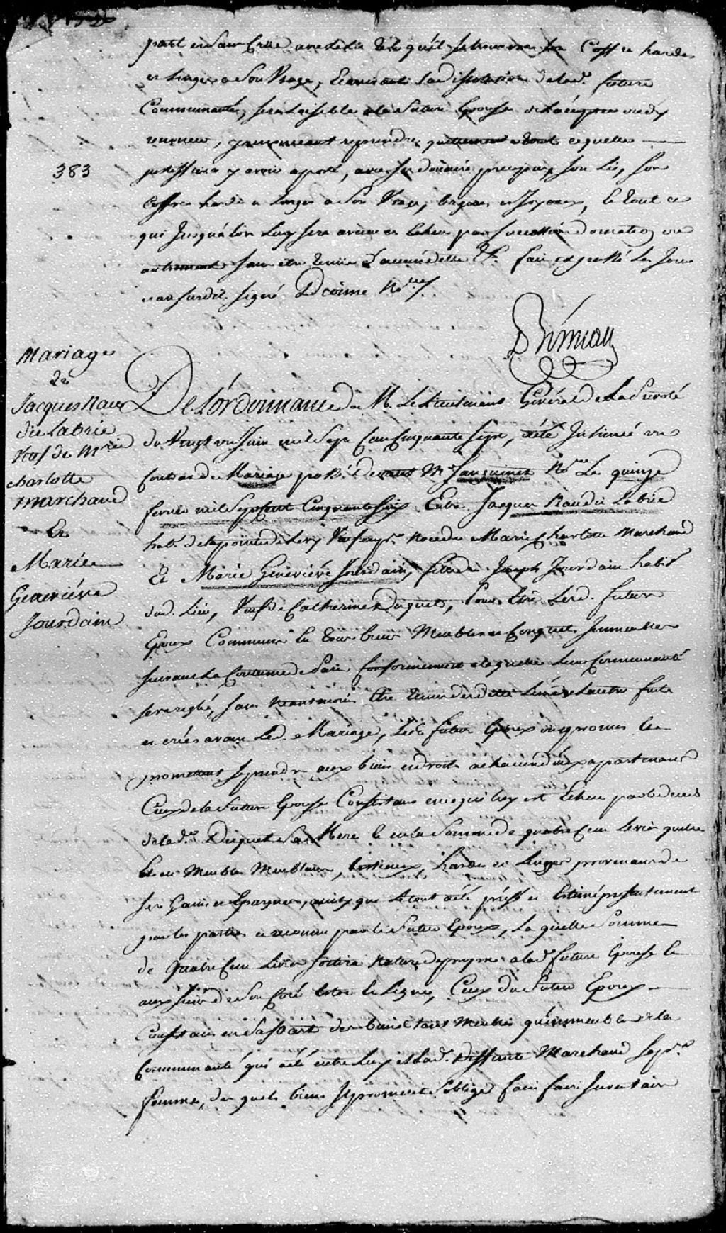 Extrait du contrat de mariage passé pardevant maître Sanguinet, notaire, entre Jacques Naud (Nault) dit Labrie, habitant de la Pointe-de-Lévy, veuf en premières noces de Marie-Charlotte Marchand; et Marie-Geneviève Jourdain, fille de Joseph Jourdain, habitant dudit lieu, et de défunte Catherine Duquet, ses père et mère