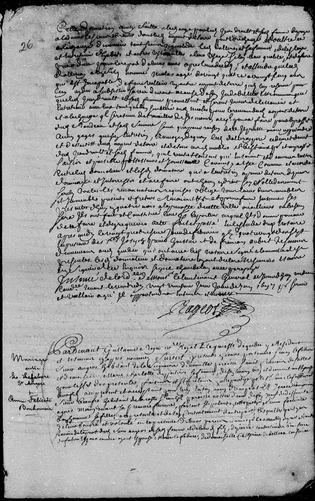 - La pièce se compose d'un contrat de mariage passé par-devant Guillaume Roger, notaire royal en la Prévôté de Québec, entre Louis Lefebvre, fils de Simon Lefebvre, sieur Angers, habitant de la seigneurie de Neuville, paroisse Saint-François-de-Sales, et de Marie-Charlotte de Poitiers; et Anne-Félicité Bonhomme, fille de Ignace Bonhomme, sieur de Beaupré, habitant de la côte Saint-Michel, paroisse Notre-Dame-de-Foy et de défunte Agnès Morin, sa première femme; en présence de Pierre Constantineau, comme ayant épousé Marie Lefebvre; Catherine de Belleau; François Provost, écuyer lieutenant du roi, et Geneviève Macard, son épouse; Anne Poirier, seconde épouse du sieur Ignace Bonhomme; Vincent Poirier dit Bellepoire, capitaine de milice et bourgeois de Québec; Marie-Madeleine Morin, veuve de feu Gilles Rageot, vivant greffier en chef de la Prévôté de Québec; Charles Rageot, greffier en chef de ladite Prévôté, et Geneviève Gauvreau, son épouse [...]