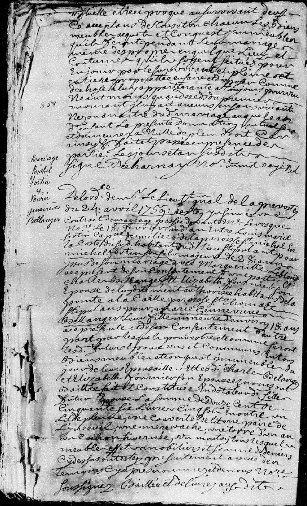 Extrait du contrat de mariage passé pardevant maître Lévesque, notaire, entre Michel Fortin, âgé de 28 ans, fils majeur de Louis-Marie Fortin, capitaine de milice de la paroisse Saint-Michel en la côte du Sud, habitant dudit lieu, et de Marguerite Leblond, ses père et mère; et Marie-Geneviève Bellanger (Bélanger), âgée de 18 ans, fille mineure de Charles Bellanger (Bélanger) et Élisabeth Fournier, ses père et mère, habitants de la Pointe-à-la-Caille, paroisse Saint-Thomas, 18 février 1759 [Document insinué le 24 avril 1759], Archives nationales à Québec, Fonds Cour supérieure. District judiciaire de Québec. Insinuations, (03Q,CR301,P4525).