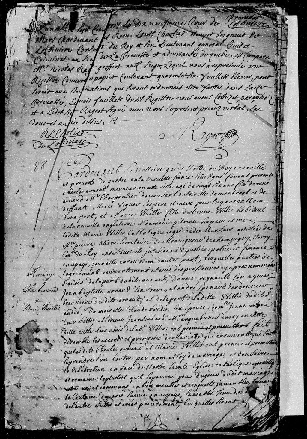 Contrat de mariage passé par-devant maître Genaple, notaire garde-notes du roi, entre Charles Arnaud, menuisier de Québec, âgé de 26 ans; et Marie Willis, catholique âgée de 19 ans...