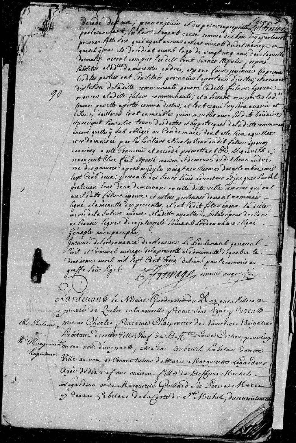 Contrat de mariage passé pardevant Genaple, notaire garde-notes du roi en la ville et Prévôté de Québec, entre Charles Fontaine, charpentier de navires et navigateur, habitant de la ville de Québec; et Marie-Marguerite LeGardeur..., 27 avril 1701 [Document insinué le 12 avril 1703], Archives nationales à Québec, Fonds Cour supérieure. District judiciaire de Québec. Insinuations, (03Q,CR301,P482).