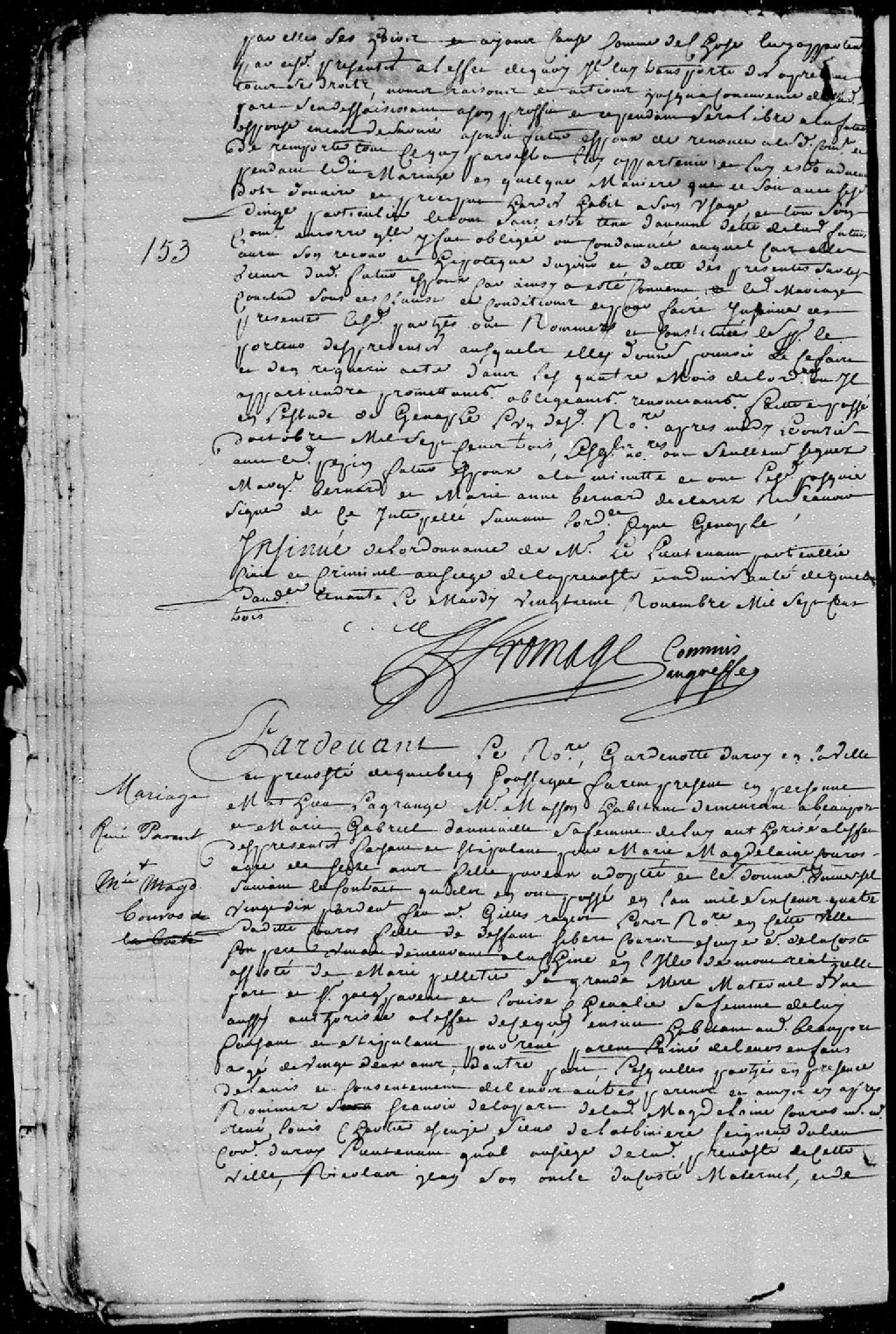 Contrat de mariage passé par-devant maître Genaple, notaire garde-notes du roi en la ville et Prévôté de Québec, entre René Parent, âgé de 22 ans, fils aîné de Jacques Parent et de Louise Chevalier; et Marie-Madeleine Courault...