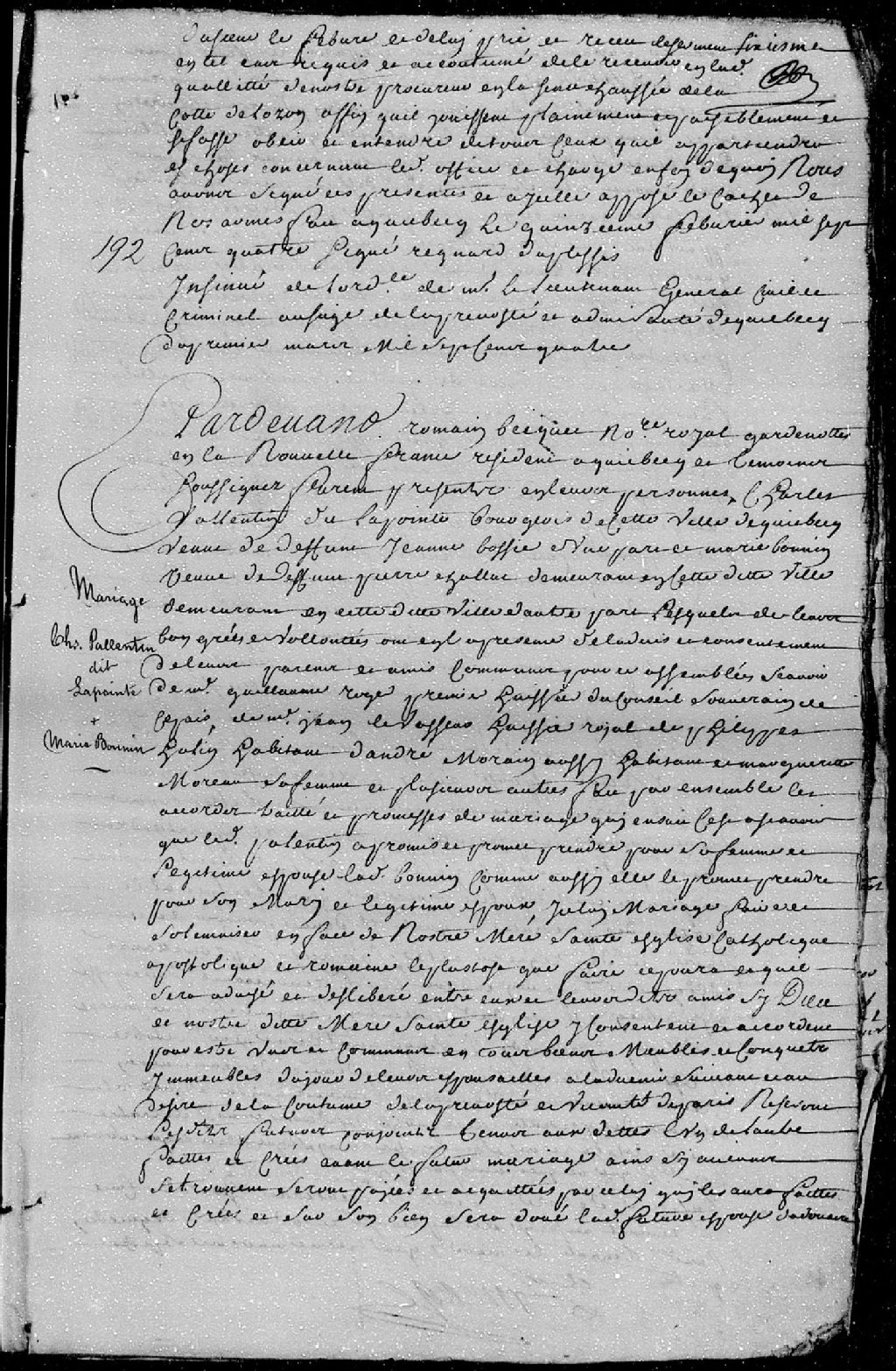 - La pièce se compose d'un contrat de mariage passé par-devant Romain Becquet, notaire royal garde-notes en la Nouvelle-France, entre Charles Pallentin dit Lapointe (Palentin), bourgeois de Québec, veuf de défunte Jeanne Beaucier; et Marie Bonin, veuve de défunt Pierre Chalut, demeurant en la ville de Québec; en présence de Guillaume Roger, premier huissier au Conseil souverain de Québec; Jean Levasseur, huissier royal; André Morin et Marguerite Moreau, sa femme; sont également présents les sieurs Étienne Marandeau (Maranda) et Jean Marois, témoins