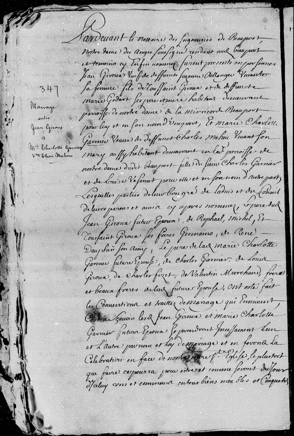 Contrat de mariage passé pardevant maître Duprac, notaire des seigneuries de Beauport et de Notre-Dame-des-Anges, entre Jean Giroux, veuf de défunte Suzanne Bélanger, fils de Toussaint Giroux et de défunte Marie Godard, ses père et mère, habitants demeurant en la paroisse de Notre-Dame-de-la-Miséricorde, en la seigneurie de Beauport; et Marie-Charlotte Garnier, veuve de défunt Charles Maheu, vivant habitant de la susdite paroisse, et fille de Charles Garnier et de Louise Vésinat (Vézina)