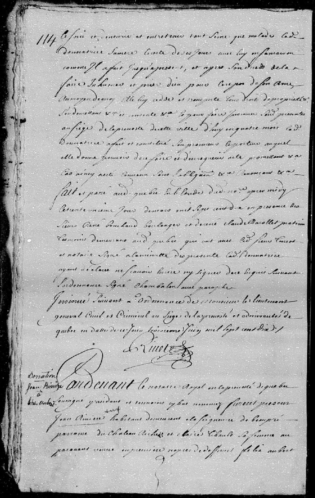- Le titre complet de la pièce se lit comme suit : Donation d'une terre, avec maison de colombage et tous les meubles, ustensiles et autres effets qui en dépendent, par Jean Rivière, habitant demeurant en la seigneurie de Beaupré, paroisse du Château-Richer, et Claire Thibault, sa femme, veuve en premières noces de défunt Félix Aubert; à Charles Aubert, fils mineur issu du mariage entre le défunt Aubert et Claire Thibault, âgé de près de 25 ans; ladite donation, passée par-devant maître Chambalon, notaire royal en la Prévôté de Québec, est ratifiée le 21 janvier 1710 par Charles Cloutier, habitant demeurant en la côte de Beaupré, au nom et comme tuteur de Charles Aubert, donataire