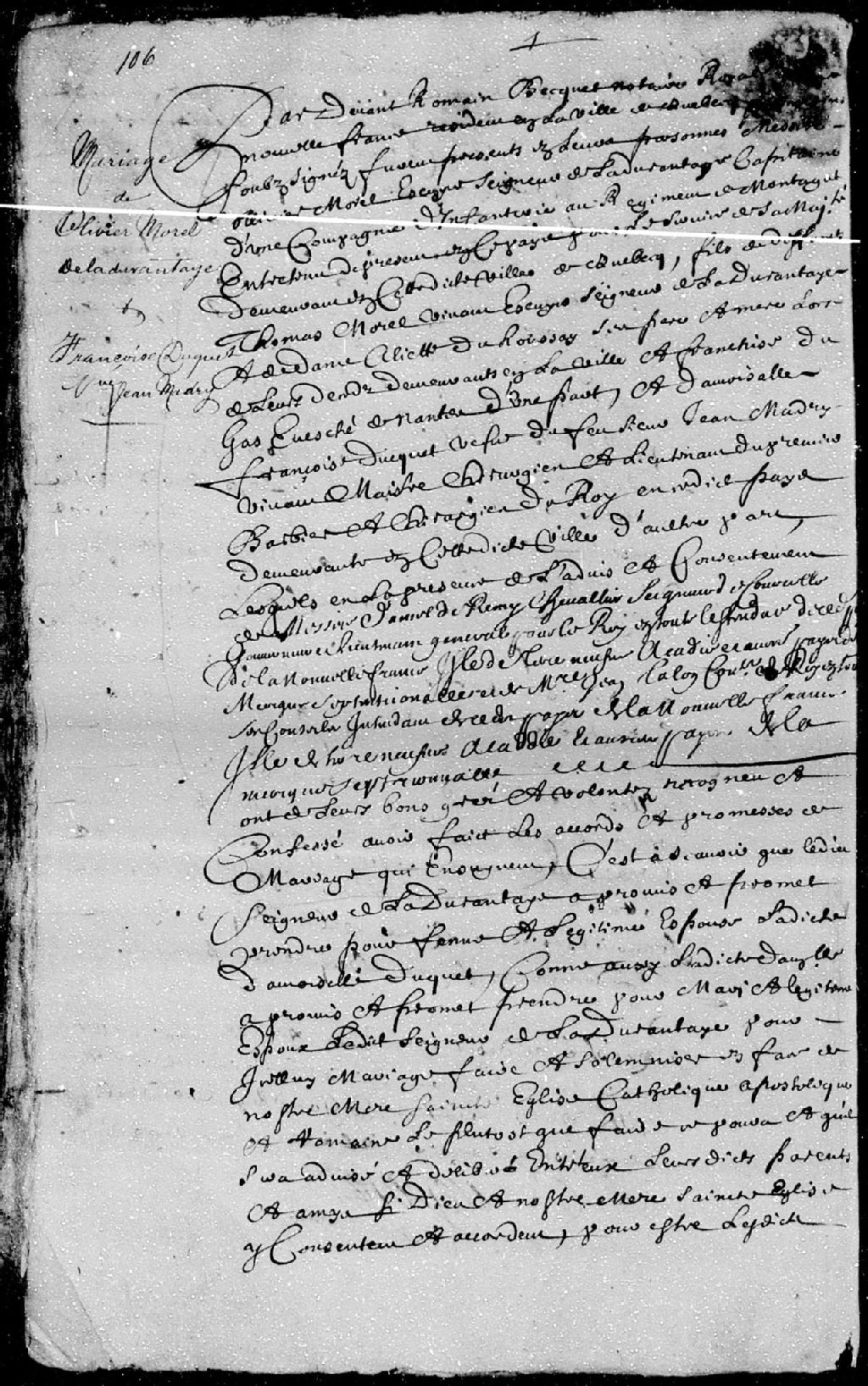 - La pièce se compose d'un acte de mariage entre Olivier Morel, seigneur de la Durantaye, capitaine d'une compagnie d'infanterie au régiment de Montagne entretenu en Nouvelle-France pour le service de Sa Majesté, fils du feu Thomas Morel, de son vivant écuyer, seigneur de la Durantaye, et de dame Alliette du Houssay, ses père et mère décédés en la ville de Franchise à Nantes, et Françoise Duquet, veuve en première noce du feu Jean Madry, de son vivant maître chirurgien et lieutenant du premier barbier et chirurgien du Roi, sont présent messire Daniel de Rémy, chevalier, seigneur de Courcelle, gouverneur et lieutenant général pour Sa Majesté en Nouvelle-France, messire Jean Talon, conseiller du Roi en ses Conseils d'état et privé, intendant au Canada, Terre-Neuve et Acadie, amis desdits futurs époux, Jean-Baptiste Gosset et Jacques Boucheval, demeurant à Québec, sont témoins