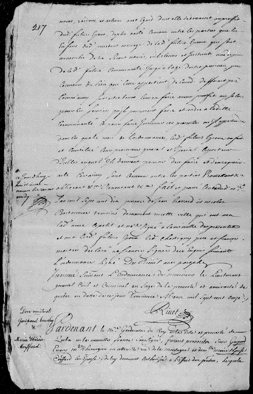 Donation mutuelle passée pardevant maître Genaple, notaire garde-notes du roi en la ville et Prévôté de Québec, entre Gaspard Émery, maître chirurgien de Québec, domicilié rue de la Montagne, et Marie-Thérèse Coiffard, sa femme, de tous leurs biens meubles et immeubles, 24 mai 1709 [Document insinué le 10 mars 1711], Archives nationales à Québec, Fonds Cour supérieure. District judiciaire de Québec. Insinuations, (03Q,CR301,P671).