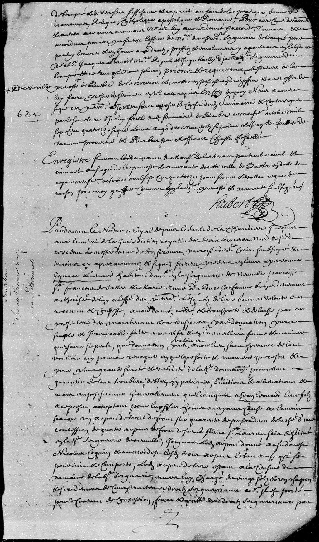 Donation d'une terre sise et située en la seigneurie de Neuville, par Ignace Léonard, habitant demeurant en la susdite seigneurie, paroisse Saint-François-de-Sales, et Marie-Anne Dubuc, sa femme; à Jean Léonard, leur fils; ladite donation est passée pardevant maître Dehorné (Dehornay), notaire royal depuis le sault de la Chaudière jusqu'aux limites de la Juridiction des Trois-Rivières