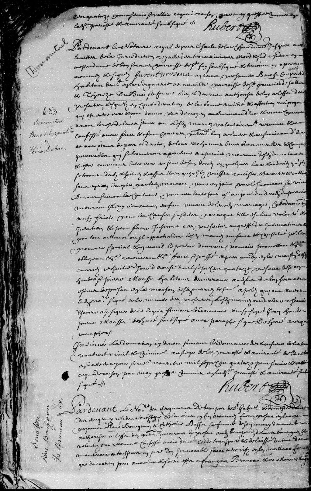 Donation mutuelle passée pardevant maître Dehorné (Dehornay), notaire royal depuis le sault de la Chaudière jusqu'aux limites de la Juridiction des Trois-Rivières, entre Benoît Carpentier, habitant demeurant en la seigneurie de Neuville, paroisse Saint-François-de-Sales, et Thérèse Dubuc, sa femme, de tous leurs biens meubles et immeubles
