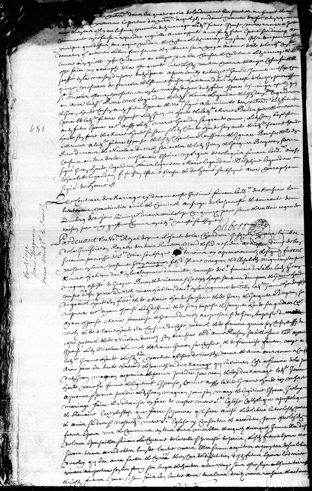 Contrat de mariage passé pardevant maître Dehorné (Dehornay), notaire royal depuis le sault de la Chaudière jusqu'aux limites de la Juridiction des Trois-Rivières, entre Jean Magnan, fils d'Étienne Magnan et d'Élisabeth Migneron, ses père et mère, habitants de la seigneurie de Neuville, paroisse Saint-François-de-Sales; et Jeanne Houde, veuve de défunt Pierre Demers, vivant habitant de la seigneurie de Tilly