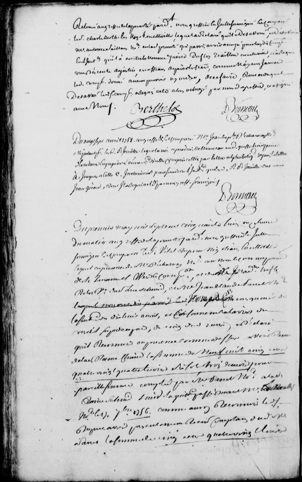 Comparution de maître Jean-Baptiste Decharnay, notaire, stipulant pour les Révérends Pères Jésuites, lequel produit trois pièces d'écriture en papier et leur inventaire, pour servir l'instance entre les Révérends Pères et Jean Girard, 27 avril 1758, Archives nationales à Québec, Fonds Prévôté de Québec, (03Q,TL1,S11,SS1,D105,P170).