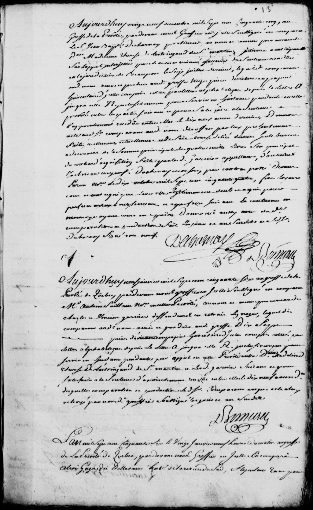 Comparution du sieur Jean-Baptiste Decharnay, praticien, au nom et comme procureur de Madeleine-Thérèse de L'estringand (Lestringant) de Saint-Martin, intimée et anticipante sur l'appel interjetté par charles Garnier et Vincent Garnier, de la sentence rendue en la Juridiction de Beauport, le 16 juillet 1755, lequel produit 13 pièces d'écriture en papier et leur inventaire pour servir l'instance entre lesdites parties, suivant la sentence d'appointement rendue entre elles le 19 août 1755, acte des offres faites par ledit comparant audit nom de faire bourse déliéede la somme principale de 4000 livres pour contrat d'acquisition faite par ledits Garnier, appelants, d'Antoine Juchereau, écuyer, sieur Duchenay, et consors, ledit contrat passé devant maître Parent, notaire, le 10 octobre 1754, Signé Decharnay