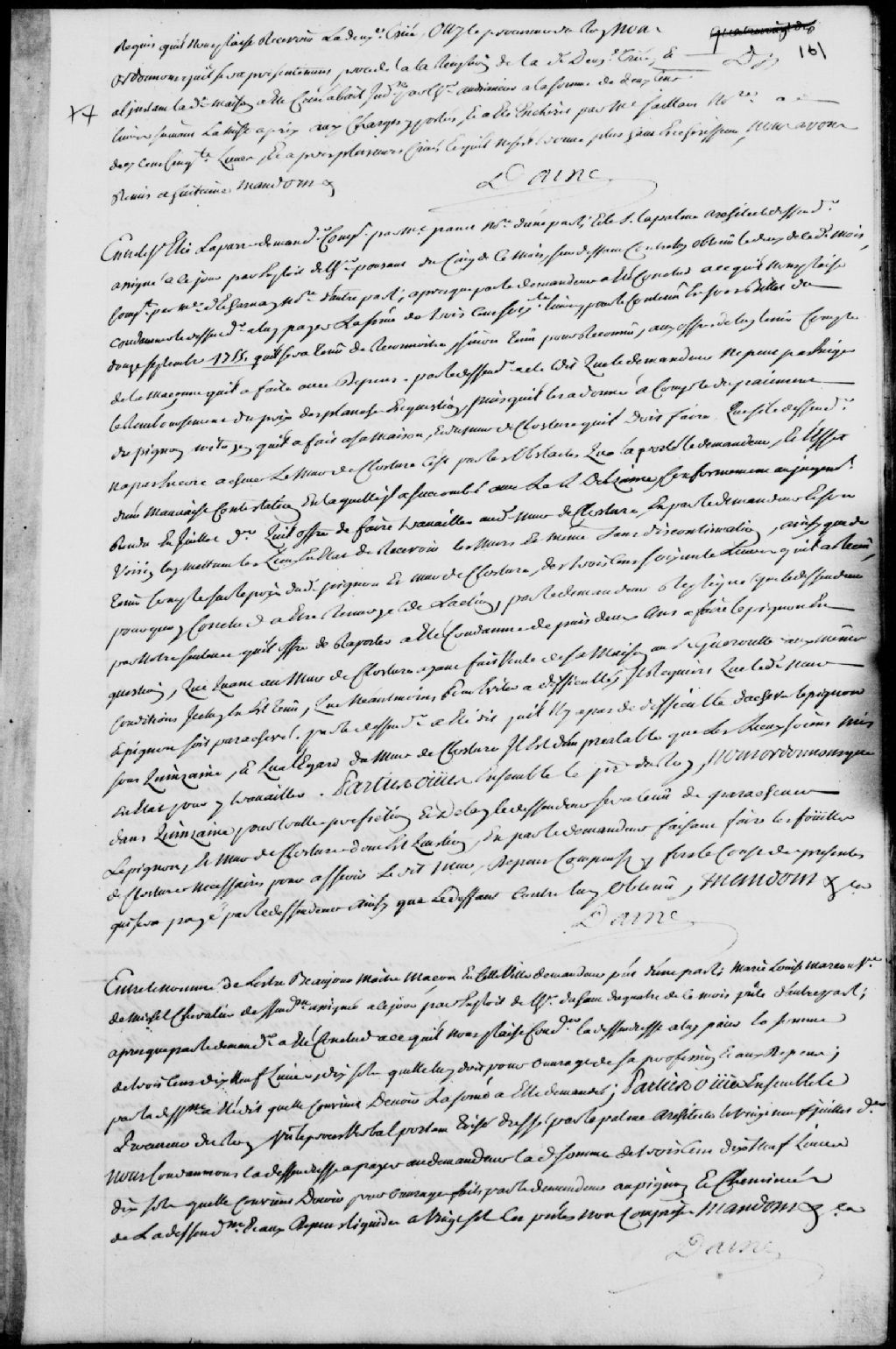 Cause entre Élie Laparre, demandeur, comparant par maître Panet, notaire; et le sieur Lapalme, architecte, défendeur, comparant par maître Decharnay, notaire, ledit demandeur réclame la somme de 360 livres en vertu d'un billet du 12 septembre 1755 alors que ledit défendeur réplique que le demandeur ne peut exiger le remboursement du prix des planches en question puisqu'il les a données à compter du paiement du pignon mitoyen qu'il a fait et du mur de clôture qu'il doit faire, mention des sieurs Delzaine (Delzenne) et Gueroutte (Guérout - Guéroult), il est ordonné que ledit défendeur soit tenu de parachever le pignon et le mur de clôture en question dans quinzaine, dépens compensés