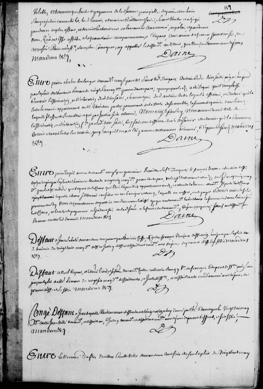Cause entre le nommé Dufot (Flot), traiteur de Québec, demandeur, comparant par maître Jean-Baptiste Decharnay, notaire; et Antoine Sabourin et Madeleine Lafarge, son épouse, tutrice des enfants mineurs issus de son premier mariage avec le défunt Antoine Bachelier, comparant par l'huissier Thibaut (Thibault), le demandeur déclare qu'il a acquis desdits défendeurs un emplacement et une maison sis rue Sainte-Anne pour la somme de 7000 livres à condition qu'il poursuive à ses frais et dépens la vente par licitation dudit immeuble à cause des droits que lesdits mineurs ont hérité de leur père dans la bâtisse du second étage qui a été construite avec les deniers dépendants de la communauté de leur père avec ladite Lafarge, il est ordonné que lesdits emplacement et maison soient vendus par licitation et adjugés au plus offrant et dernier enchérisseur suivant l'estimation qui sera faite par des experts nommés par les parties