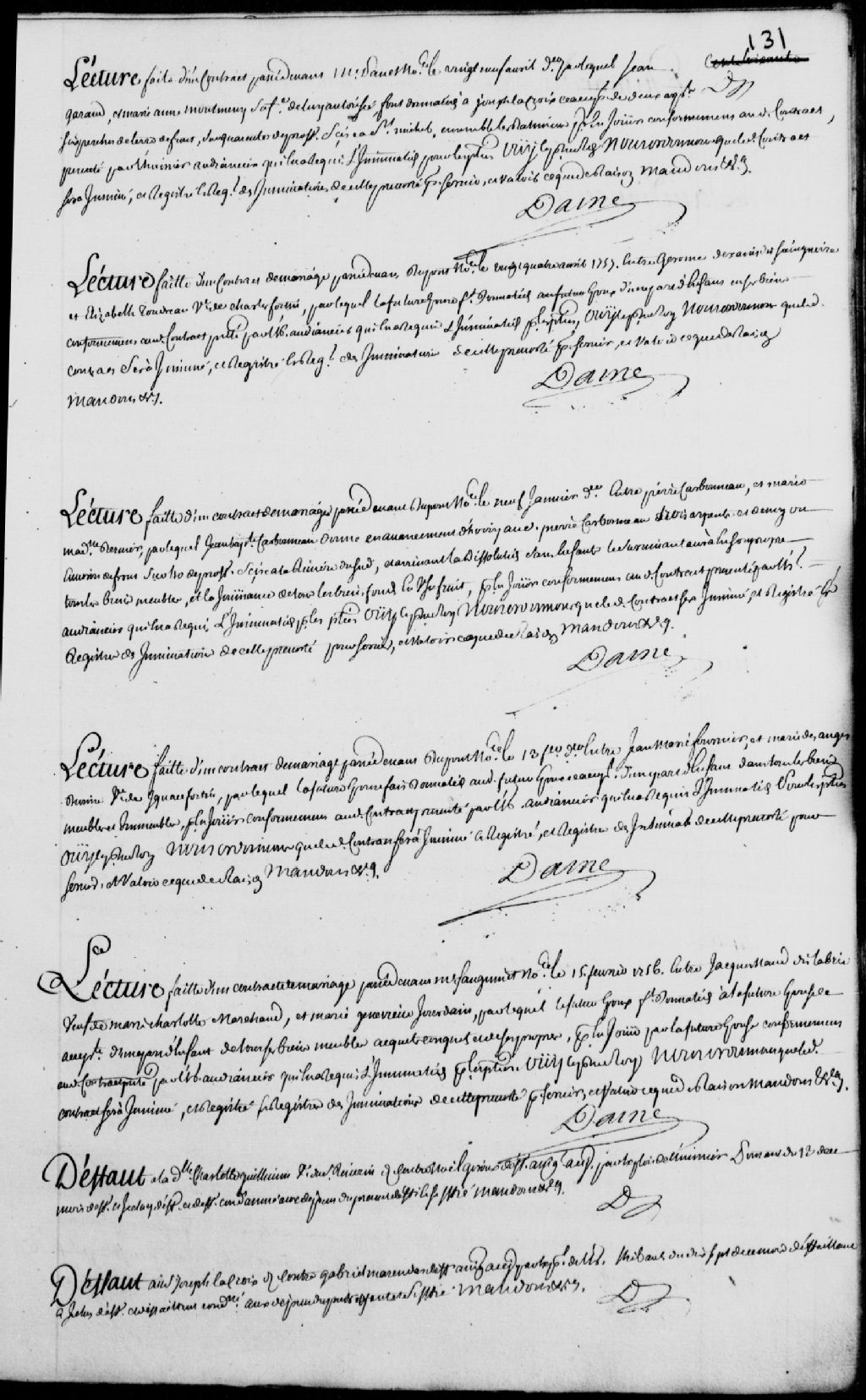 Lecture d'un contrat passé par-devant maître Sanguinet, notaire, le 15 février 1756, entre Jacques Naud (Nault) dit Labrie, veuf de Marie-Charlotte Marchand, et Marie-Geneviève Jourdain, il est ordonné que ledit contrat soit insinué au registre des insinuations