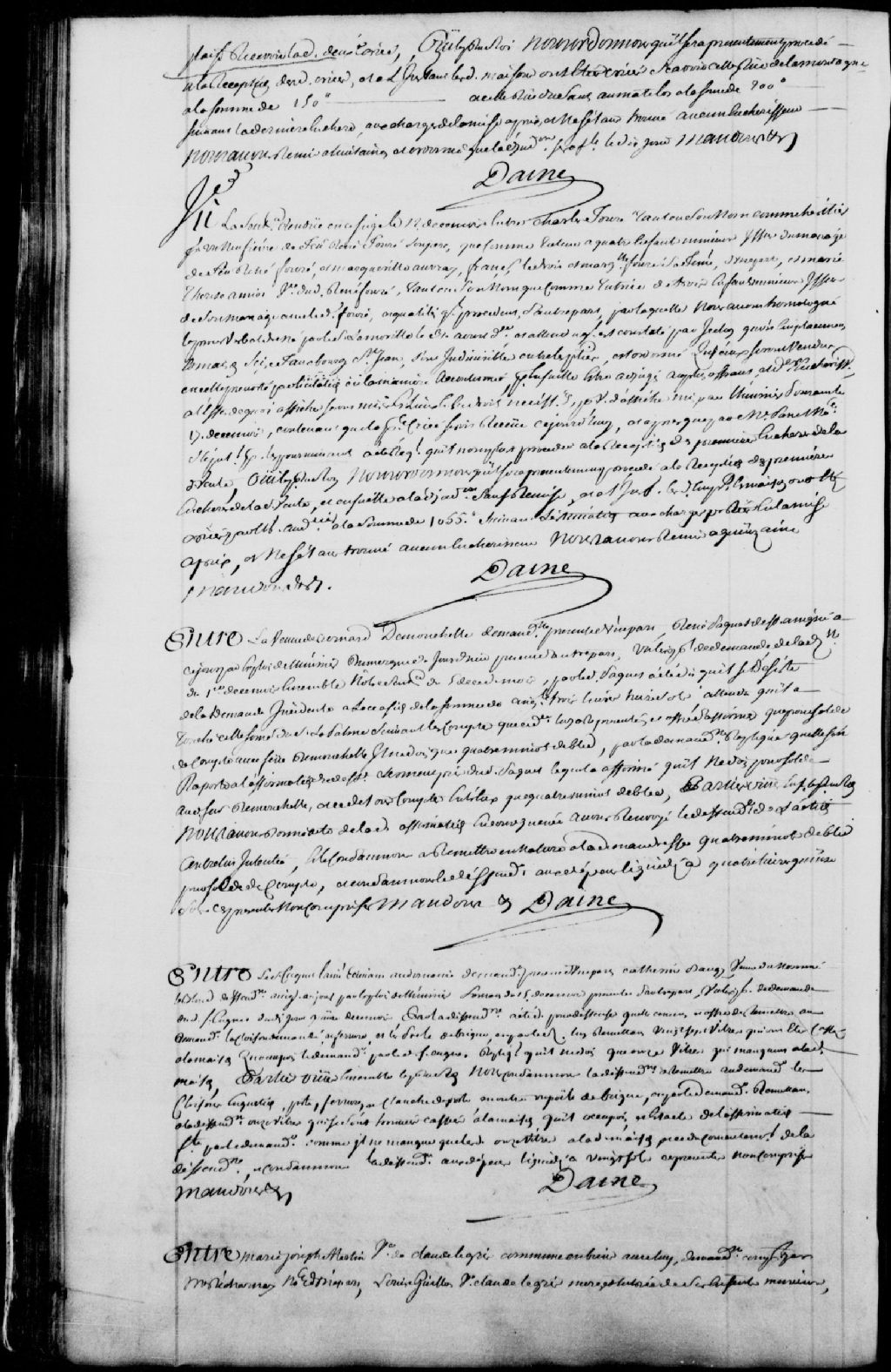 Cause entre le sieur Cugnet l'aîné, écrivain du Domaine, demandeur, et Catherine Baugy (Baugis), veuve du nommé Leblond, défenderesse, laquelle est condamnée à remettre au demandeur les cloisons, porte, serrure, clenche de porte, une montre et un poêle de brique ; ledit demandeur est condamné à remettre à la défenderesse 11 vitres qui se sont trouvées cassées à la maison qu'il occupait, et la défenderesse est condamnée aux dépens liquidés à 20 sols