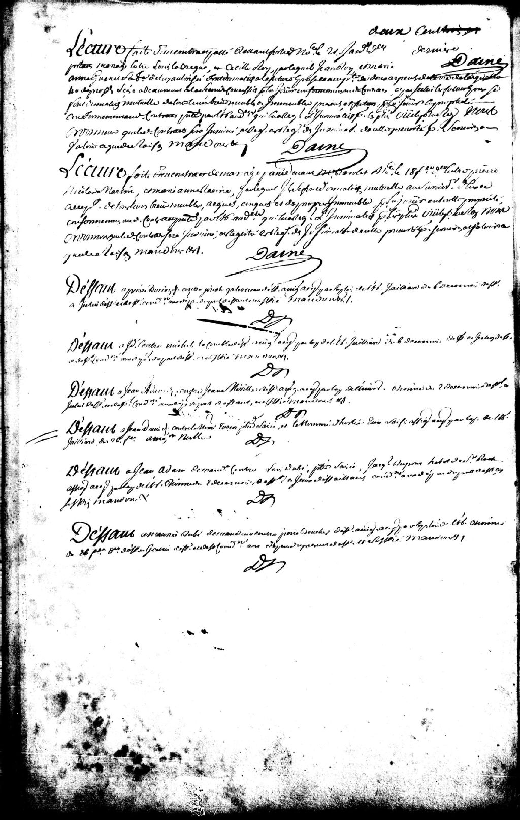 Défaut à Jean Adam, demandeur, contre François Miville, défendeur et défaillant, lequel est condamné aux dépens, 13 mars 1759, Archives nationales à Québec, Fonds Prévôté de Québec, (03Q,TL1,S11,SS1,D108,P1530).