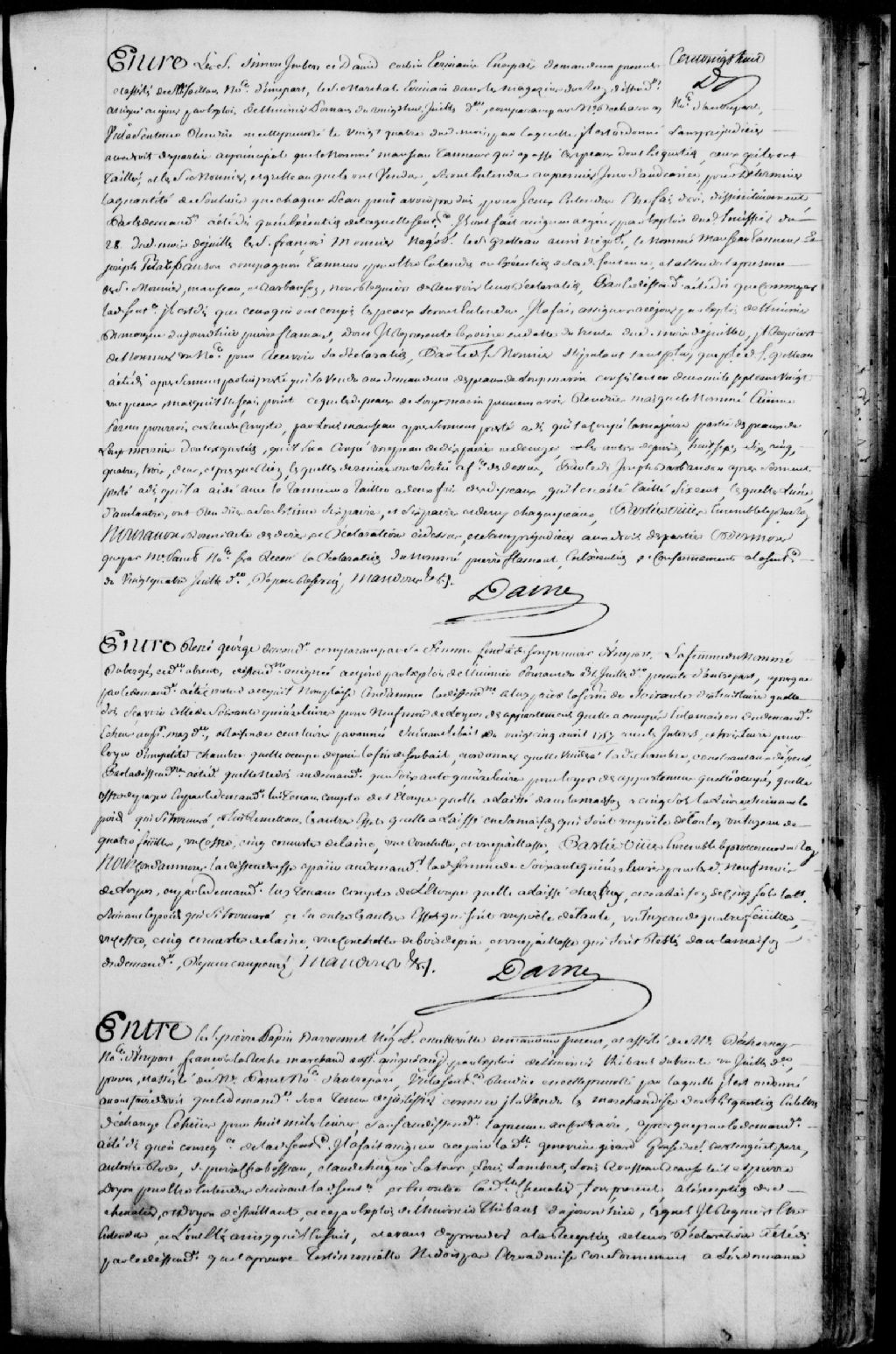 Cause entre le sieur Papin Baronnet (Baronet), négociant de Québec, demandeur, assisté de maître Decharnay, notaire, et François Laroche, marchand, défendeur, assisté de maître Panet, notaire ; assignation par le demandeur de la demoiselle Geneviève Girard, épouse du sieur Berlinguet père, d'Antoine Rode, du sieur Pierre Chabosseau (Chaboisseau), de Claude Hugues Latour, de Louis Lambert, de Louis Rousseau Beausoleil, de la demoiselle Chevalier et de Pierre Doyon, lesdits Chevalier et Doyon défaillants ; il est donné acte des dépositions des témoins, il est ordonné que lesdits défaillants seront réassignés au prochain jour d'audience et condamnés aux dépens du présent défaut, 1 août 1758, Archives nationales à Québec, Fonds Prévôté de Québec, (03Q,TL1,S11,SS1,D108,P932).