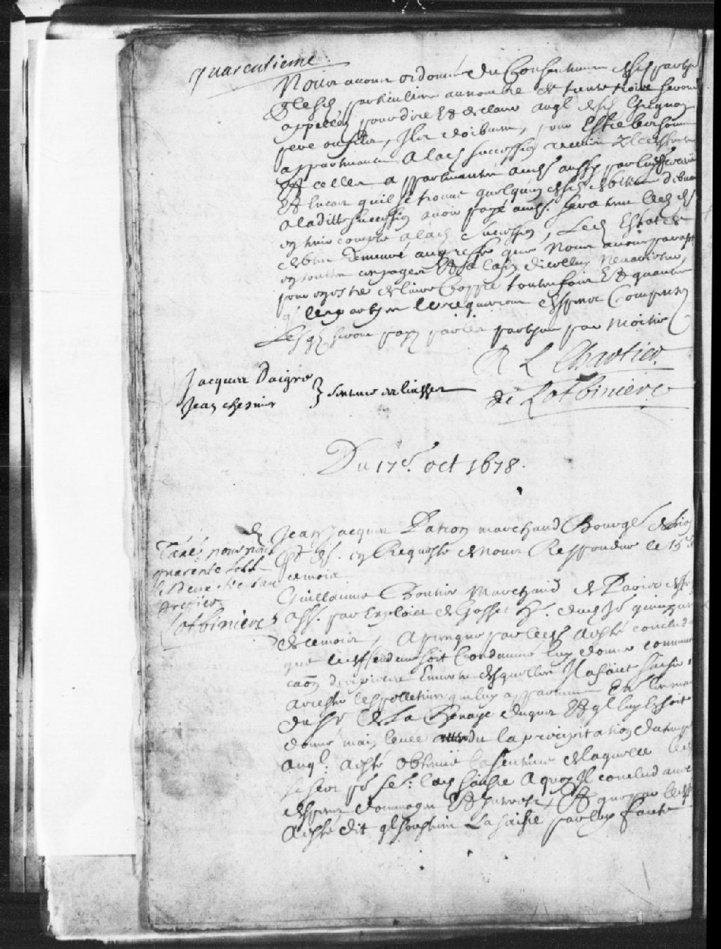 Cause entre Jean-Jacques Patron, marchand bourgeois, demandeur, et Guillaume Bouthier (Boutier), marchand ; il est fait mention du sieur de LaChenaie (LaChesnaye), il est ordonné que le défendeur fournira au demandeur une copie d'une entente à propos d'une saisie, et la cause est reportée au lendemain, 17 octobre 1678, Archives nationales à Québec, Fonds Prévôté de Québec, (03Q,TL1,S11,SS1,D12,P456).