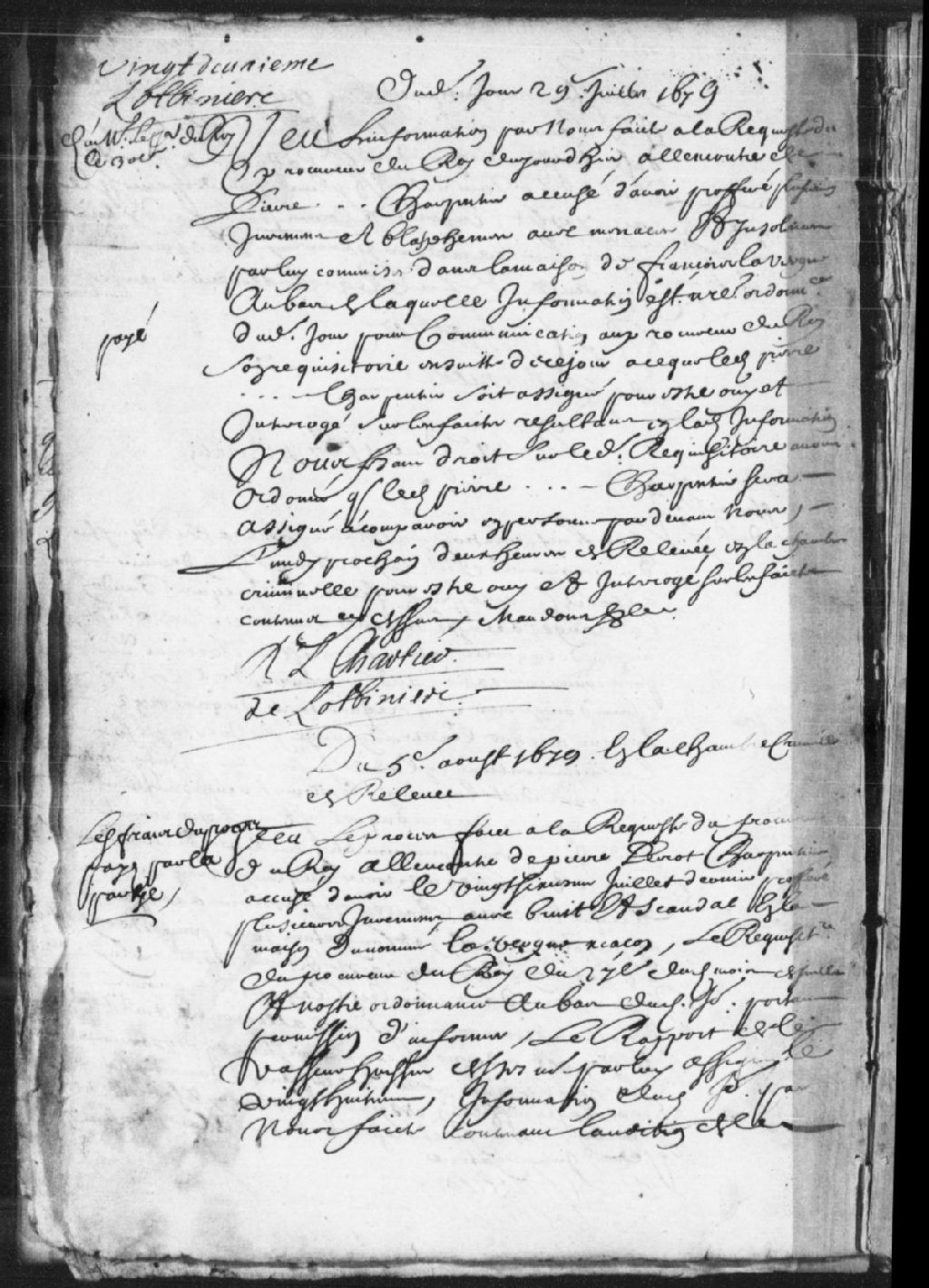 Procès de Pierre Perot (Perrault - Perrot), charpentier, accusé d'avoir proféré plusieurs injures et blasphèmes avec menaces, lesquels actes furent commis en la maison de François Lavergne ; il est ordonné de faire assigner ledit Pierre Perot afin qu'il soit interrogé