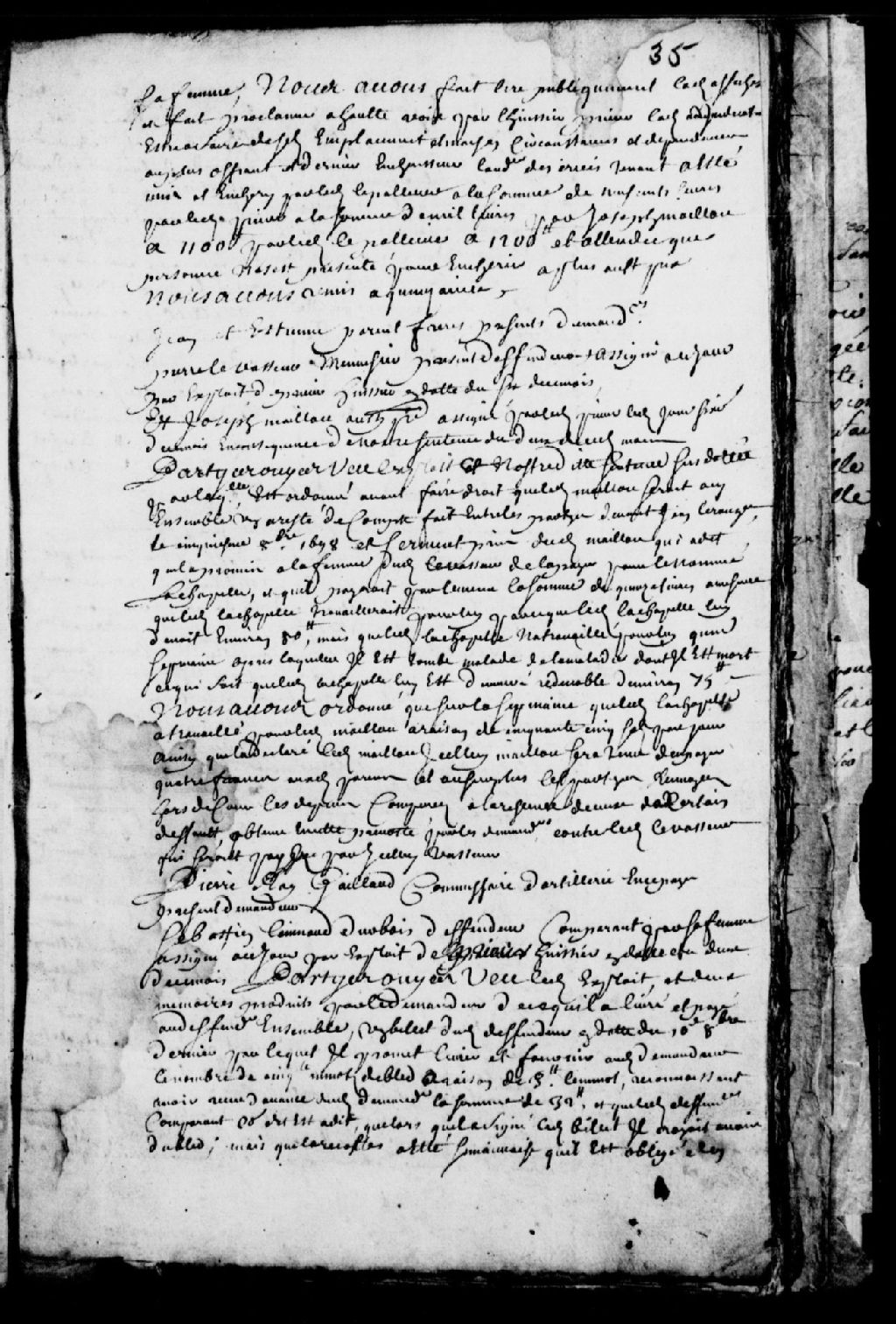 Vente à l'enchère d'un emplacement et d'une maison, Lepailleur offre 900 livres, un nommé (Pierre) Prieur offre 1000 livres, Joseph Mailloux offre 1100 livres, et encore Lepailleur offre 1200 livres, et ladite enchère est remise à quinzaine, 15 janvier 1700 au 10 mars 1700, Archives nationales à Québec, Fonds Prévôté de Québec, (03Q,TL1,S11,SS1,D24,P55).