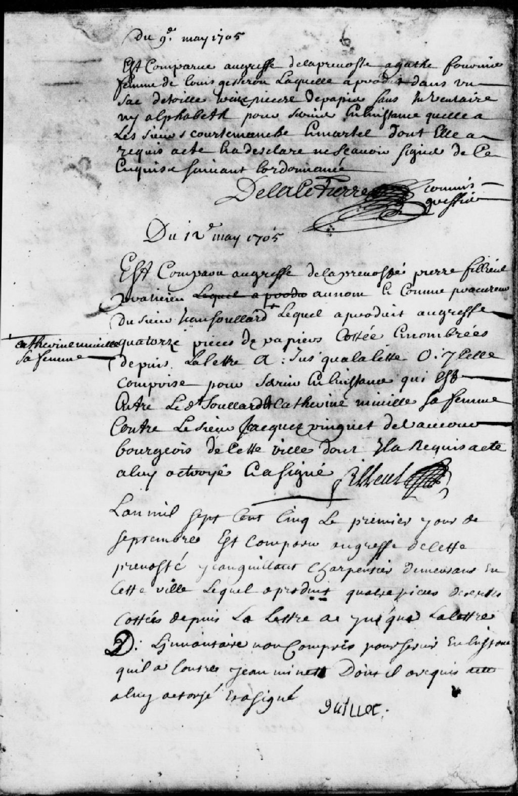 Comparution de Pierre Fillieu (Filleul), praticien, demeurant à Québec, comme procureur de Jean Soullard (Soulard) et de Catherine Miville, sa femme, et mention de quatorze pièces d'écriture cotées de A à O, en rapport avec l'instance que ledit Fillieu a auxdits noms avec Jacques Pinguet de Vaucourt (Vaucours), bourgeois de Québec