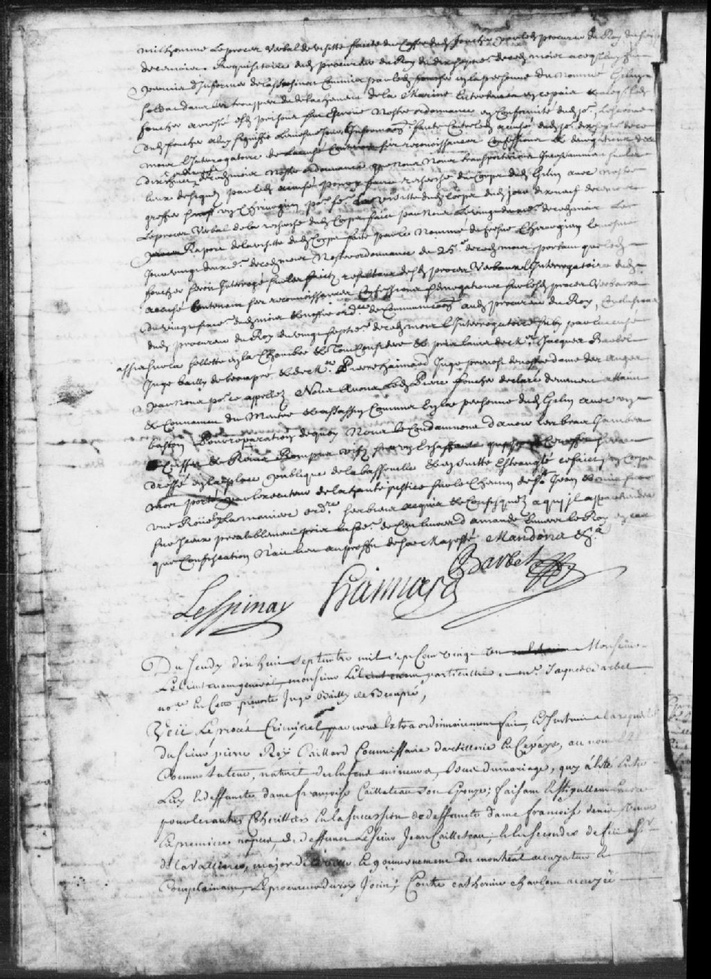 - Cause entre Pierre Rey-Gaillard, commissaire d'artillerie en Nouvelle-France, faisant au nom et comme tuteur naturel des enfants mineurs issus de son mariage avec la défunte Françoise Cailleteau (Cailteau), et faisant aussi pour les autres cohéritiers en la succession de défunte dame François Denis, veuve en premières noces du sieur Cailleteau [Jacques Cailteau de Champfleury] et en deuxièmes noces du feu sieur de La Vallière [Richard Denis (Denys), sieur de Fronsac], de son vivant major de la ville et gouvernement de Montréal, accusateur et complaignant, et Catherine Charland, accusée et prisonnière; mention du meurtre de ladite Denis, laquelle fut assassinée en sa maison, et de la visite de son cadavre, ladite Charland est condamnée, pour le meurtre en question, à être pendue et étranglée à mort à une potence plantée devant la maison de ladite défunte, son corps mort y demeurera vingt-quatre heures et sera ensuite porté par le chemin [...]