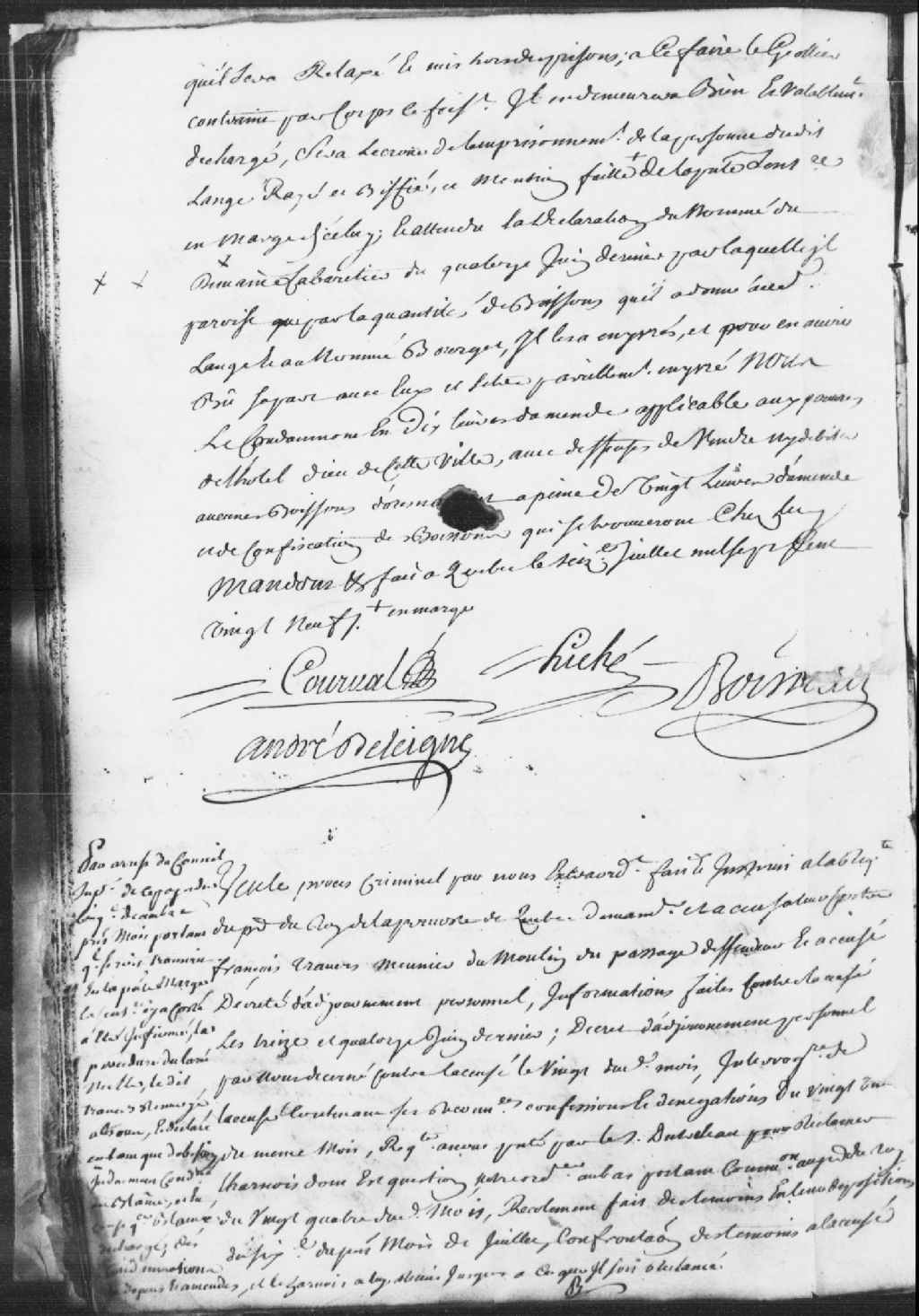Procès de François Travers, meunier du moulin du passage, défendeur et accusé ; informations et interrogatoires, mention d'un sieur nommé Dutreteau qui réclame l'harnais dont il est question, mention des témoins, récolements et confrontations, l'accusé est reconnu coupable d'avoir pris le harnais dont il est question en dépouillant le cheval qui en était revêtu, ledit coupable sera blâmé, il est condamné à 10 livres d'amende envers le Roi et aux dépens, et il est ordonné que le harnais sera rendu audit sieur Dutreteau