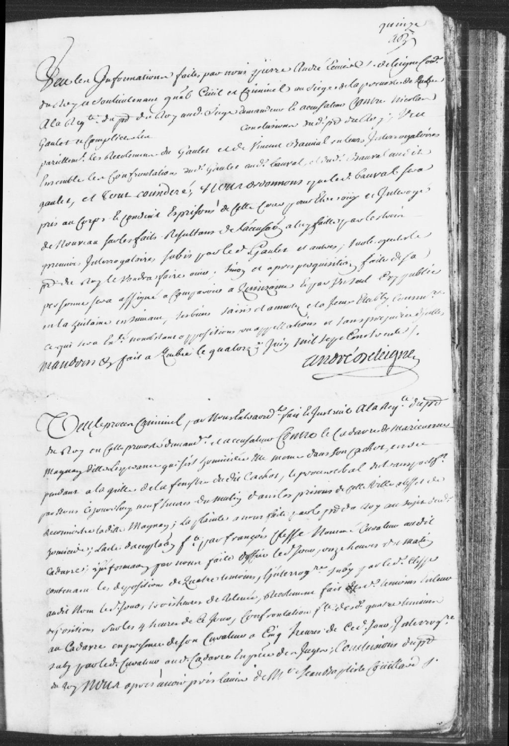 Procès contre le cadavre de Marie-Anne Magnan dit l'Espérance (Lespérance) qui s'est homicidée (suicidée) elle-même dans son cachot en se pendant à la grille de la fenêtre dudit cachot ; mention de François Clesse nommé curateur audit cadavre, mention des dépositions de quatre témoins, récolements et confrontations ; une sentence est prononcée et ladite défunte est reconnue coupable de s'être homicidée, sa mémoire est condamnée a perpétuité et son cadavre sera attaché à une charrette par l'exécuteur de la haute justice et traîné sur la place, la tête en bas et face contre terre par les rues de la ville jusqu'à la place royale en la Basse-Ville, ledit cadavre sera ensuite ramené aux prisons où il sera pendu par les pieds à une potence pour y demeuré 24 heures, il sera ensuite jeté à l'eau, tous ses biens seront confisqués au profit de Sa Majesté, suit le prononcé de la sentence, le curateur du cadavre se porte appelant de ladite sentence, 15 juin 1730, Archives nationales à Québec, Fonds Prévôté de Québec, (03Q,TL1,S11,SS1,D66,P38).