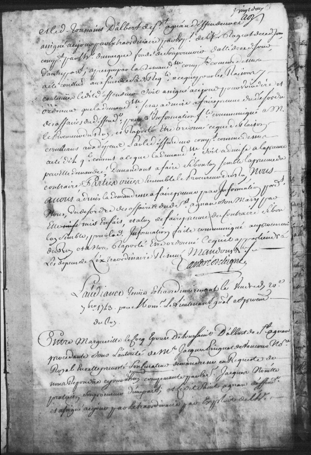 Cause entre Marguerite LeCocq (Lecoq), épouse de Toussaint D'albert (Albert - Dalbert) de Saint-Aignan (Agnan), sous l'autorité de maître Jacques Pinguet de Vaucour, notaire royal en la Prévôté de Québec, son curateur, demanderesse, comparante par le sieur Jacques Nouette, praticien, son procureur, et Toussaint D'albert (Albert - Dalbert) de Saint-Aignan (Agnan), défendeur, comparant par le sieur Dumergue, huissier chargé de son pouvoir ; il est ordonné que la demanderesse sera et demeurera séparée quant aux biens dudit Saint-Agnan, son mari, et il est ordonné que les pièces déposées demeureront sur le bureau pour être communiquées au procureur du roi