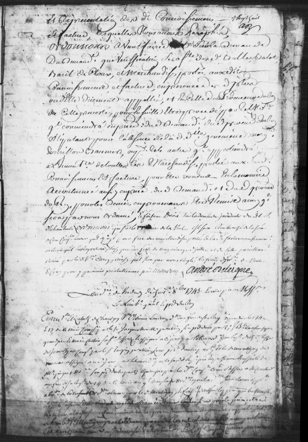 Cause entre Élizabeth de Chauvigny (Chavigny - Dechavigny), veuve du feu Étienne Landron (Landeron), demanderesse, comparante par Jacques Nouette, praticien, son procureur, et Jean-Baptiste Larchevesque (Larchevêque) Grandpré et Marie Cartier, son épouse, défendeurs, comparant par le sieur Turpin, praticien, leur procureur, et le sieur Montigny de Vaucour, aussi défendeur, assisté de maître Pinguet, notaire, son procureur ; mention d'une saisie de meubles et effets qui doivent être vendus, mention de la sentence du 18 juin 1743, mention d'un contrat de constitution passé le 21 janvier 1691, et ordonnance à l'effet que lesdits effets saisies seront vendus, avec les deniers de ladite vente, que ledit Montigny payera la somme de 150 livres pour 6 mois de loyer, et que lesdits Larchevesque (Larchevêque) seront condamnés aux dépens liquidés à 29 livres, 7 sols et 6 deniers