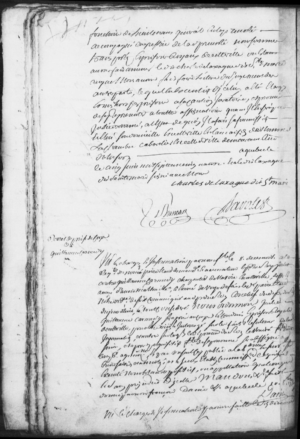 Procès de Charles Delaxaque (Laxaque) dit Sainte-Marie, soldat de la compagnie de Lusignan, en garnison à Québec, accusé et prisonnier ; informations, arrestation, interrogatoires, dépositions de deux témoins, récolements et confrontations ; il est ordonné qu'il sera plus amplement informé du cas contre ledit Sainte-Marie pendant 3 mois, il sera entre-temps relâché des prisons avec obligation de se présenter à toute assignation ; suit le prononcé du jugement à l'accusé qui fait élection de domicile en la maison du nommé LaChambre, cabaretier de Québec